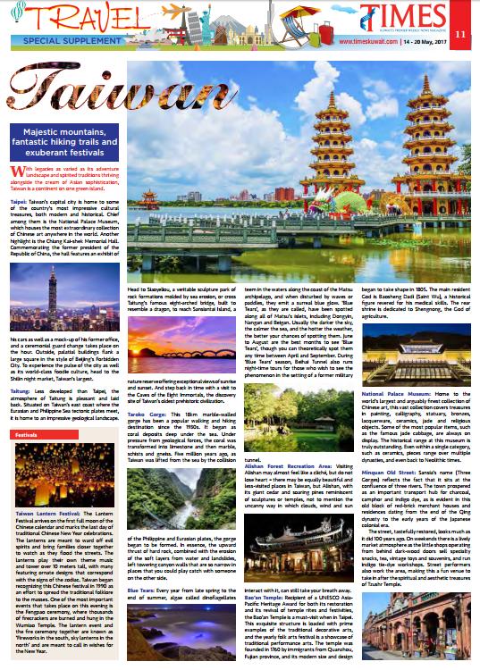 科威特英文媒體「科威特時報週刊」(The Times Kuwait)於5月21日-27日紙本及電子報中均刊載專文:「台灣-雄偉之山脈-美麗登山路徑,蓬勃節日」(Taiwan, Majestic mountains, fantastic hiking trails and exuberant festival),該文以整版圖文報導有關我國名勝古蹟及旅遊景點,包括介紹我國首都台北市是最令人印象深刻之文化瑰寶之一,擁有現代及歷史古蹟、台灣東海岸與菲律賓板塊相連,是令人印象深刻之地質景觀、花蓮太魯閣峽谷、馬祖藍色眼淚、阿里山森林遊樂園、獲得聯合國教科文組織維護遺產獎之保安宮、擁有世界最特別中國藝術品之國家故宮博物院、以及三峽老街等