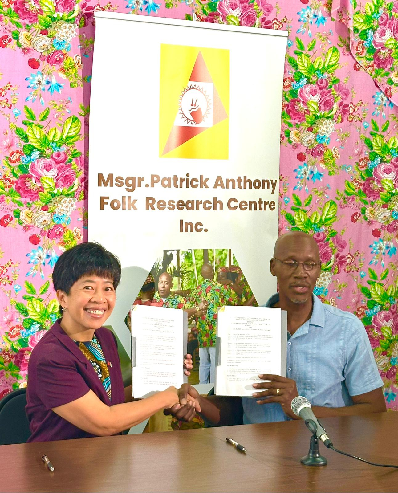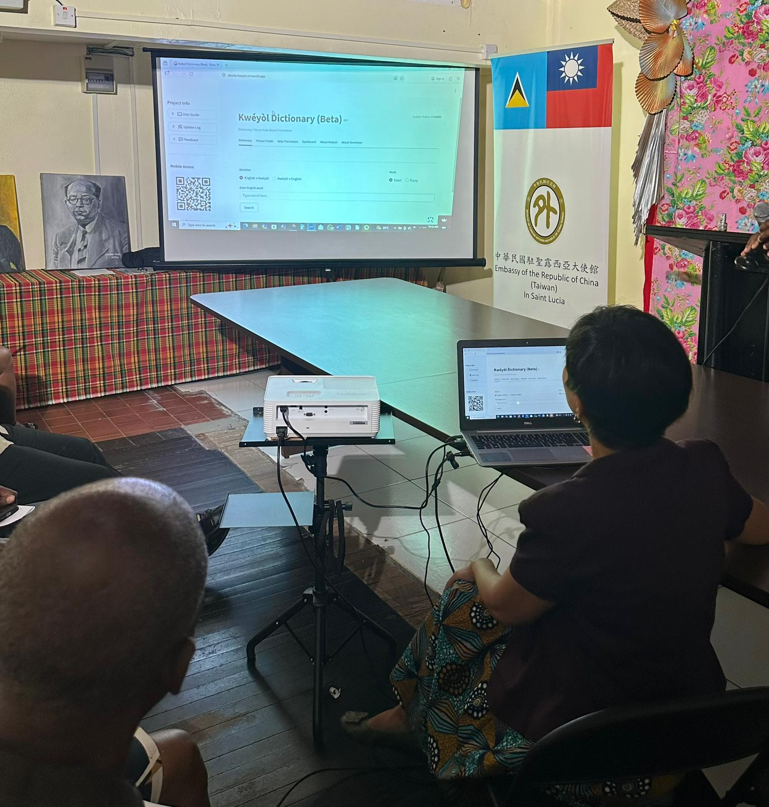 很高興正式將「Kwéyòl–English 線上字典」移交給民俗研究中心(FRC),並由副總理兼文化部長、以及教育部共同見證合作意向書的簽署。這個計畫在台灣技術團的支持下順利完成,並由實習生邱子銘將原本的紙本字典轉化為完整的線上平台。