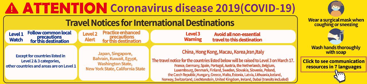 The Central Epidemic Command Center (CECC) announced on March 14 that, considering the frequent movement of citizens in the Schengen Area, it will raise the travel notice on March 17, to Level 3: Warning, for all Schengen countries including France, Germany, Spain, Portugal, Austria, the Netherlands, Belgium, Luxembourg, Denmark, Finland, Sweden, Slovakia, Slovenia, Poland, the Czech Republic, Hungary, Greece, Malta, Estonia, Latvia, Lithuania, Iceland, Norway, Switzerland and Liechtenstein, in addition to Italy, which is already on Level 3. The United Kingdom and Ireland, enjoying free movement in the Area, are also now on Level 3. Dubai (transits included) is also on the list. People are advised to avoid nonessential travel to these countries. Starting form 2pm, March 14, those already on board are asked to practice more stringent self-health management, whereas travelers yet on board will have to follow a 14-day home quarantine. Staring from March 17, foreign travelers required to follow home quarantine can pay to stay at the group quarantine facilities if they do not have other places to reside in.