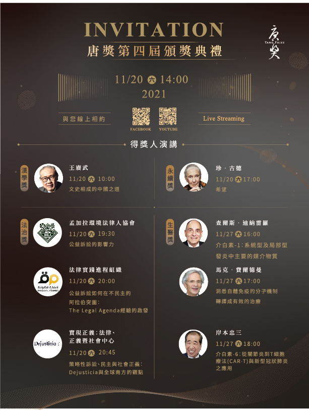 本屆8位得主演講內容從宏觀思維出發、分享激勵人心的故事、啟發多面向思考,期盼為後疫情時代社會提供穩健的秩序與安定的力量。本館歡迎大眾踴躍於11月20日及11月27日至下列網址聆聽: https://www.youtube.com/user/theTangPrize https://fb.watch/9j_hGh76ne/
