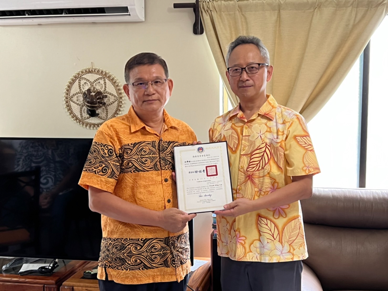 本館夏季昌大使於本(113)年1月1日上午10時主持中華民國113年元旦升旗典禮暨僑界新年茶會,本館全體館員、駐馬技術團與臺灣衛生中心員眷及此間臺僑等共計約40餘人參與活動。典禮期間,夏大使向僑界及同仁祝賀新年,並在稍後舉行的新年茶會中代表僑委會頒贈台灣駐馬紹爾群島同鄉會前會長林學銘先生感謝狀,以及新任會長王煜豪先生賀狀。