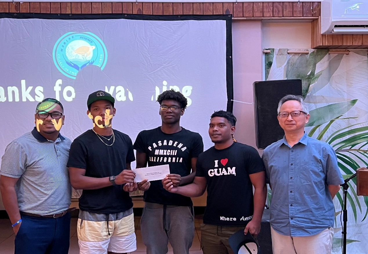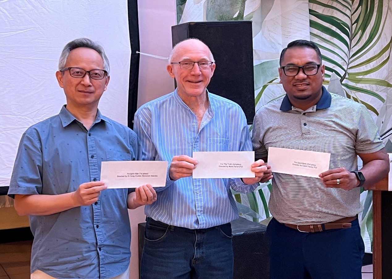 夏大使(左)與馬國文化暨內政部長Jess Gasper Jr.(右)及馬紹爾週報主編兼PMI共同創辦人Giff Johnson(中)頒獎予短片競賽得獎人