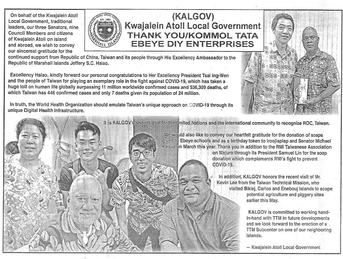 Kwajalein Atoll Local Government Thanks ROC (Taiwan)