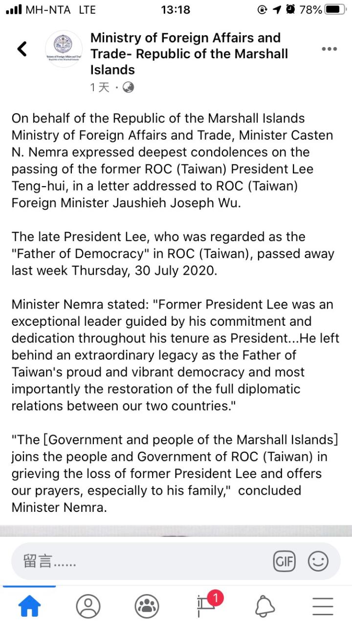We would like to thank Minister Casten N. Nemra for his sincere condolences to former President Lee Teng-hui. The government and people of Taiwan treasure the friendship between ROC(Taiwan) and RMI during the difficult time.