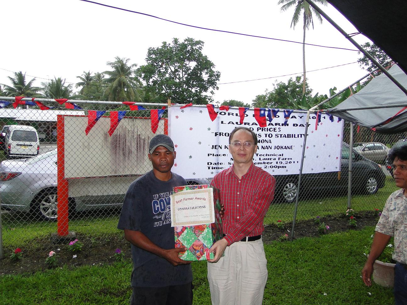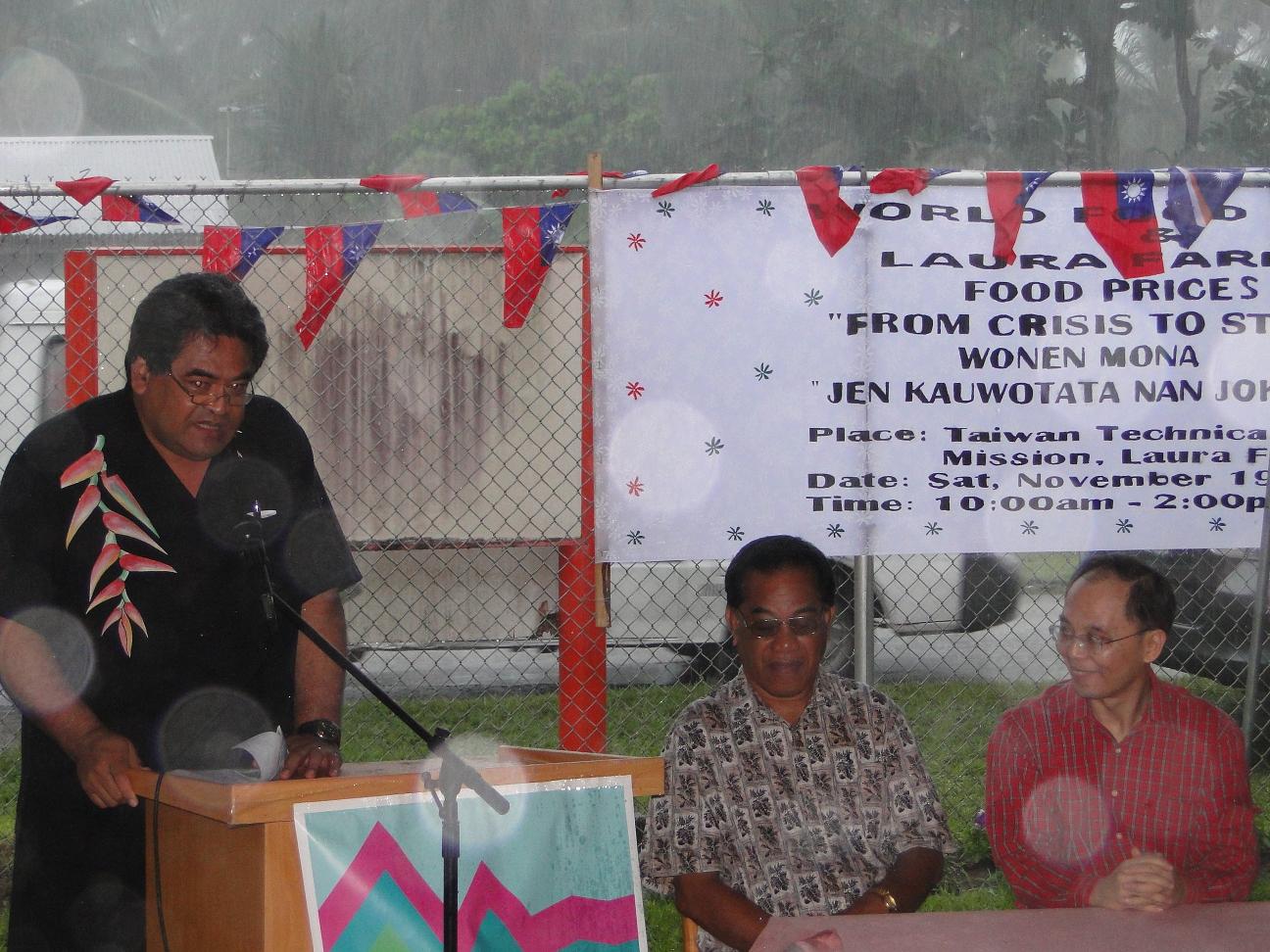 The Embassy of the Republic of China (Taiwan) and the Ministry of Resources and Development, with the assistance of RMI Ministry of Health, Taiwan International Cooperation and Development Fund (ICDF) Technical Mission (Laura Farm), Taiwan Health Center, the College of the Marshall Islands, and under the sponsorship and participation of the United Nations Food and Agriculture Organization (UNFAO), jointly held the annual Laura Farm Day/World Food Day on 19 November 2011. H.E. Ambassador George T.K. Li of the Republic of China (Taiwan), Hon. Minister Mattlan Zackhras of RMI Resources and Development, Hon. Minister Amenta Matthew, H.E. Ambassador Martha Campbell, Hon. Charge d’Affaires ad interim Fumiyoshi Kashima, Dr. Vili Fuavao as UNFAO Sub-Regional Representative for the Pacific Islands, Acting Mayor Carlson Timothy of Majuro Atoll and approximately 300 other guests all attended the Farm day/World Food Day event. Followed by remarks given by Acting Mayor Timothy, H.E. Ambassador Li, Hon. Minister Zackhras and UNFAO Sub-Regional Representative Fuavao and their awarding prizes to the 3 selected most outstanding farmers of the year, cooking demonstration, blood sugar screening, open house and tours of Laura Farm and auction of piglets all contributed to making this annual Farm Day/World Food Day a great sensation and success.