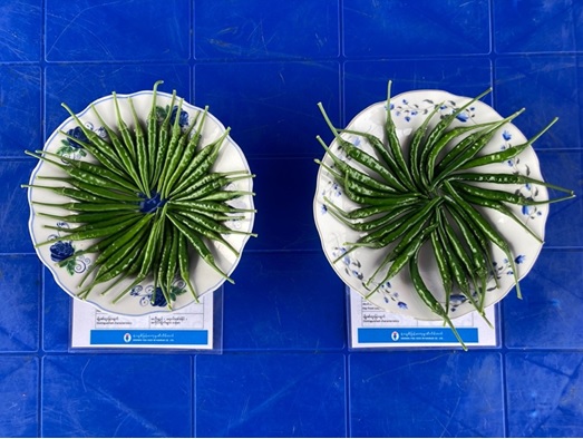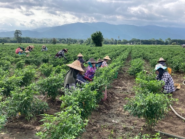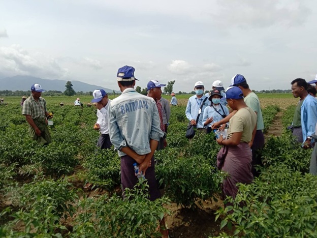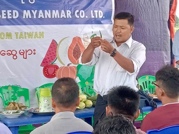 農友種苗公司致力推廣台灣優良蔬菜品種及栽培技術,經過多次測試,選拔出C001朝天型辣椒,於2021年開始在奈比都大宮地區駐點推廣,以期改善農民收益,並於2022年開始提供該區農民進行試種。結果顯示,C001品種分枝性好、產量高、相較於當地品種更抗病、果型長直且硬,耐運輸性好,當地盤商評價甚高。農友種苗公司特於6月16日於大宮辦理田間觀摩會,會中試作農戶U Thant Soe表示,本(6)月辣椒售價高,綠果售價達每緬斤3,000緬元,預計今年收穫頗豐。