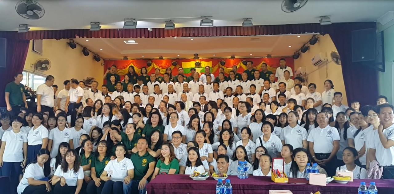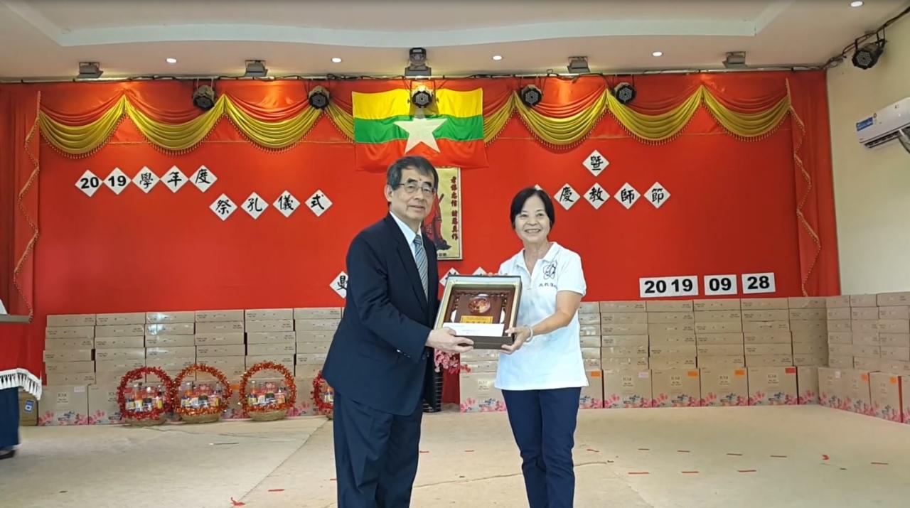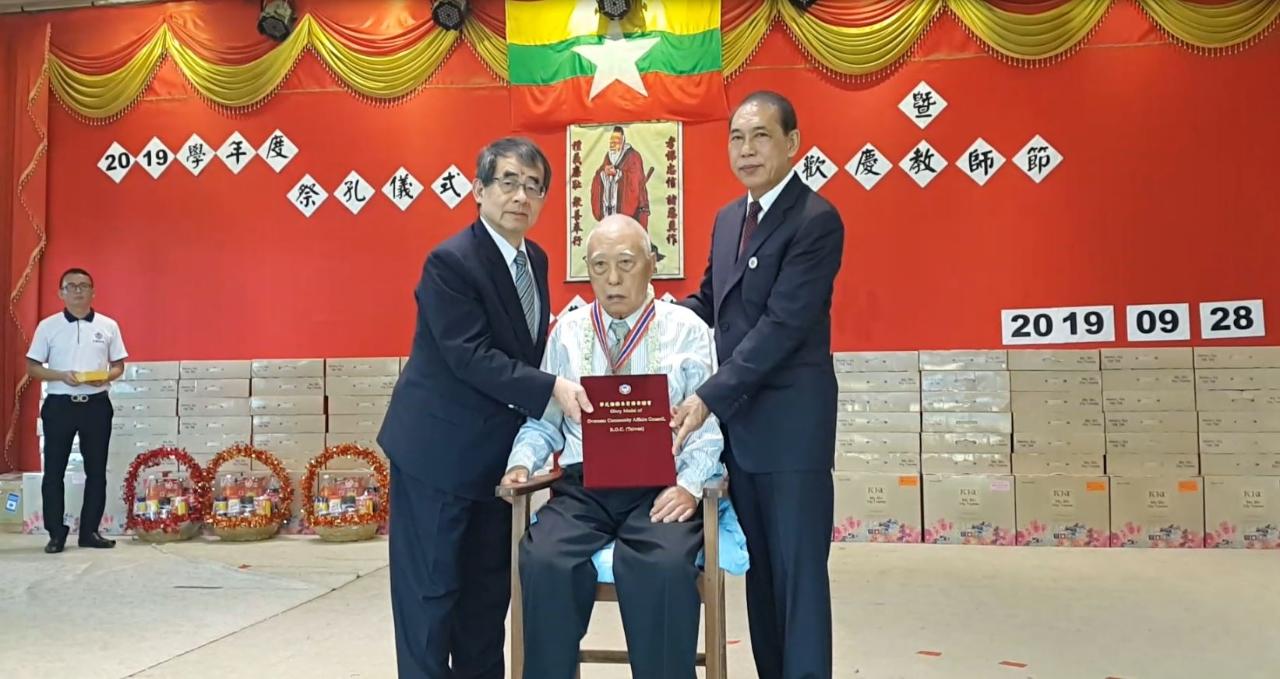 駐緬甸代表處代表張俊福代表僑務委員會委員長吳新興博士,9月28日上午前往曼德勒孔教學校頒贈段必堯「華光僑務專業獎章」,董事長毛富林、副董事長、各區校長及師生400多人到場觀禮。
