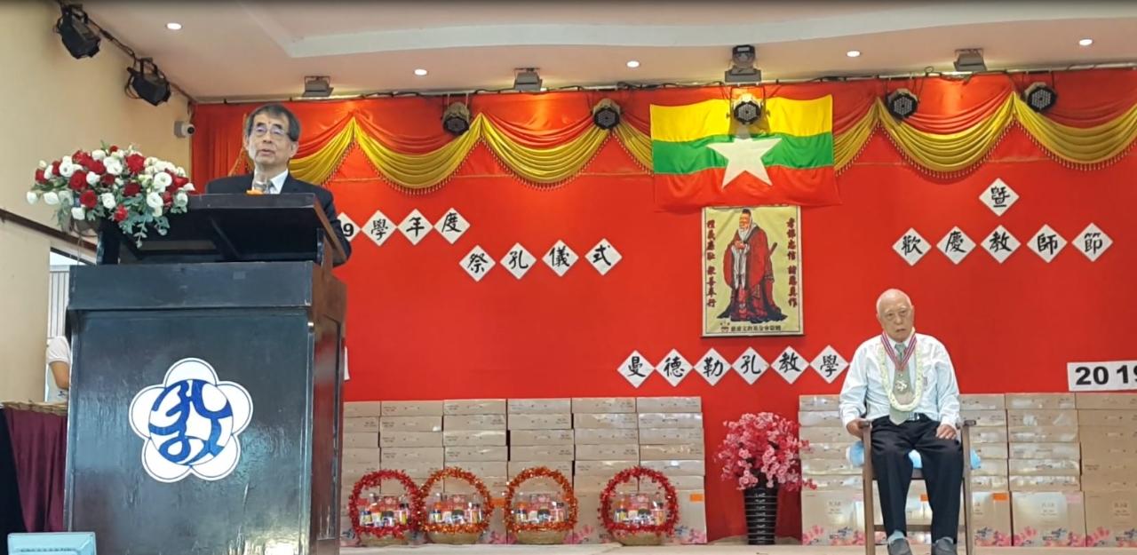當天,曼德勒孔教學校也舉辦祭孔儀式及歡慶教師節活動。張俊福代表僑務委員會頒發8名資深師長獎章、獎座,包括尹正榮總校長(10年屆)、副董事長兼副校長杜鴻昌(20年屆)、董事長兼副校長張朝剛、李恬芝老師(30年屆)、毛玉華老師(40年屆)、鍾月英老師、余金秀、王碧羨(50年屆)。
