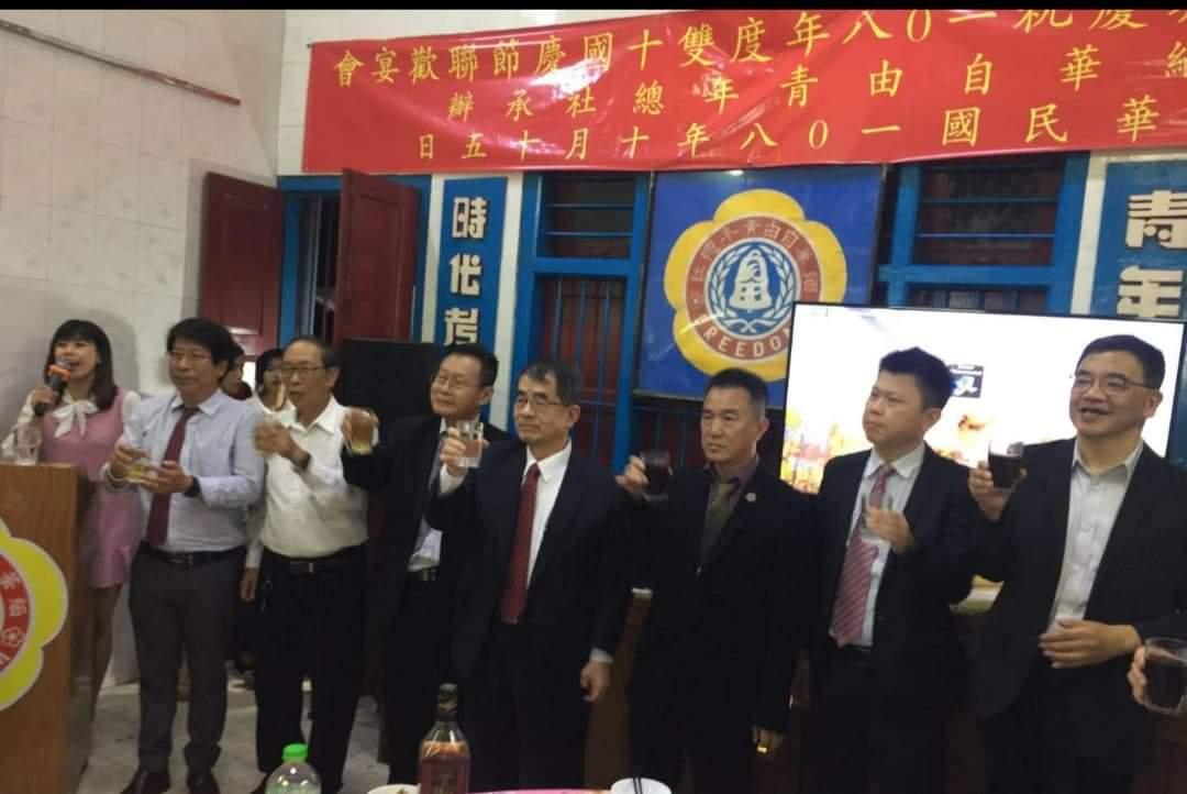 緬華各界慶祝中華民國108年國慶聯歡宴會,10月15日晚間在緬華自由青年總社舉行,駐緬甸代表處代表張俊福帶領經濟組組長蕭俊、簡任秘書李光興以及僑務組組長張文華,與20多個僑團近百名代表一起祝福中華民國108歲生日快樂。