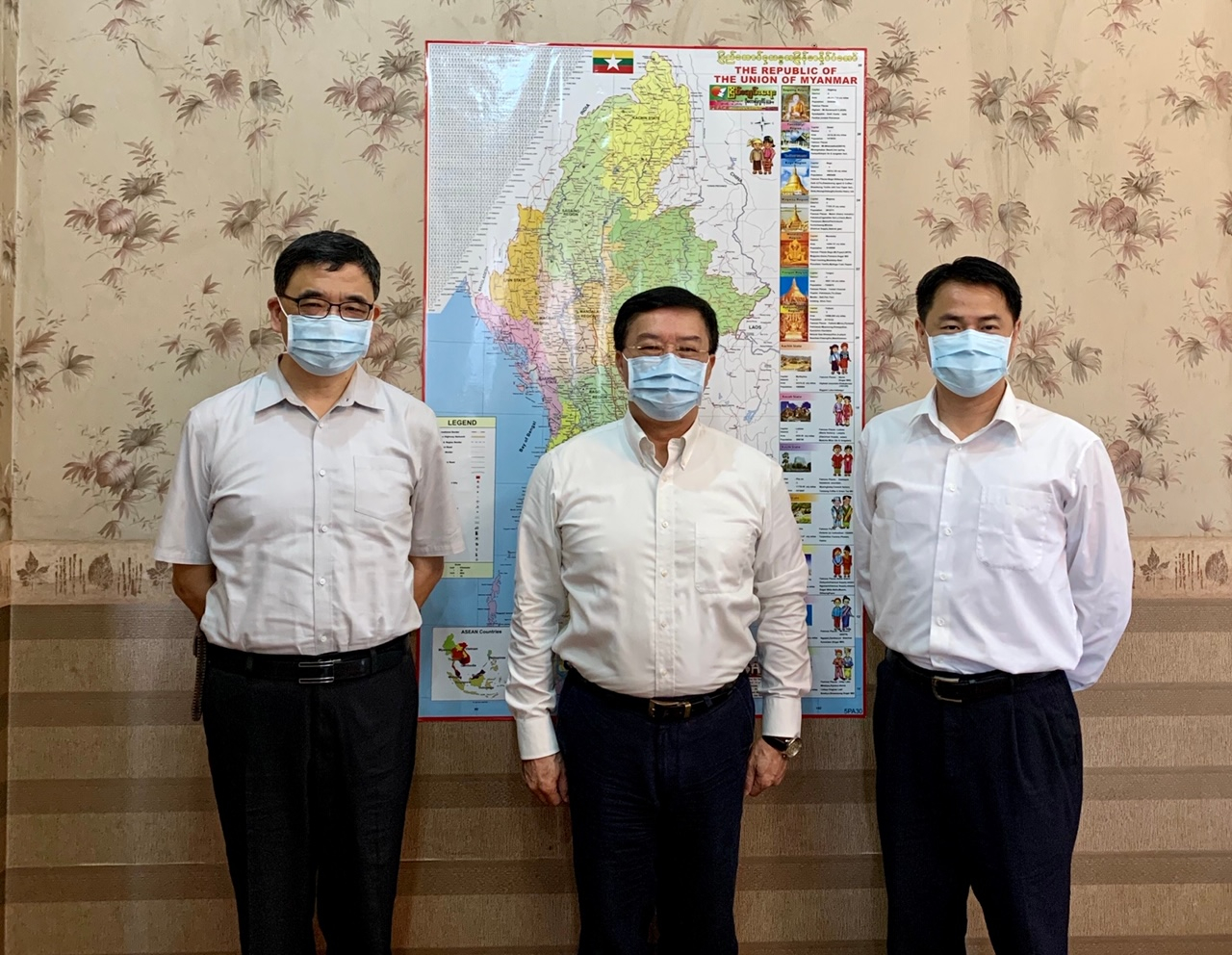 駐緬甸代表處李朝成大使(中)偕經濟組蕭俊組長(左)與永豐金租賃股份有限公司緬甸辦事處李開國代表(右)合影
