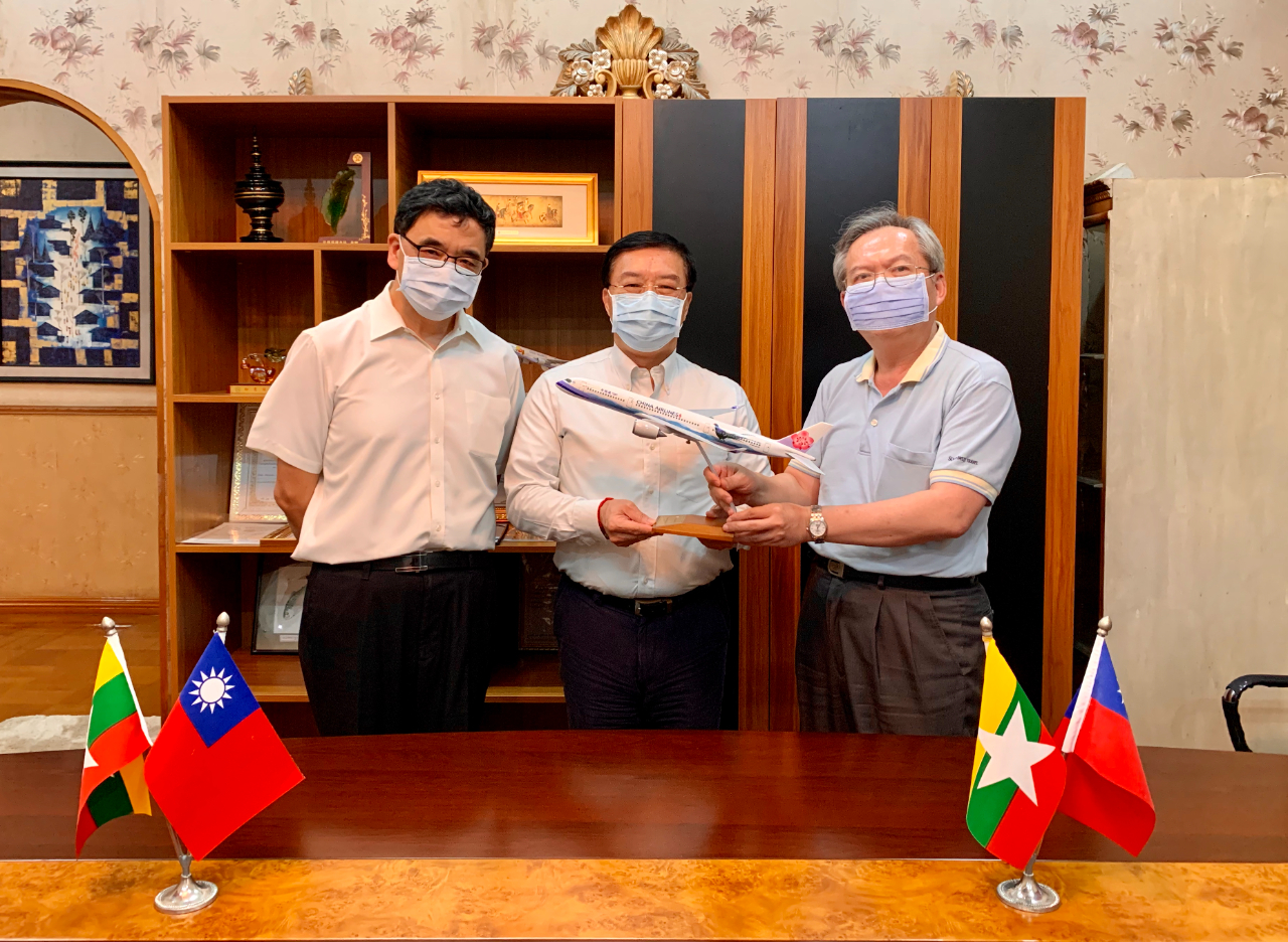 駐緬甸代表處李朝成代表(中)與中華航空公司緬甸分公司林智義總經理(右)、經濟組蕭俊組長(左)合影