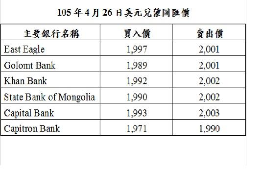 105年4月26日蒙古主要銀行美元匯價表