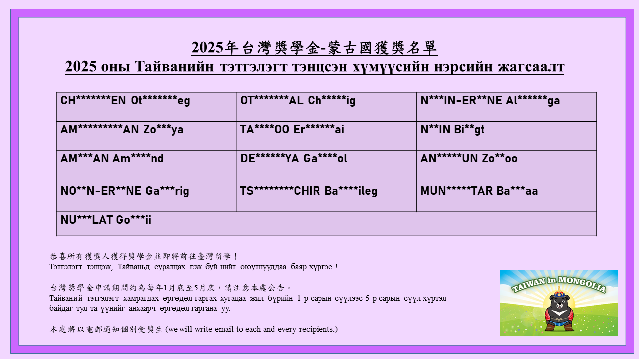Тэтгэлэгт тэнцэж Тайваньд суралцах гэж буй нийт оюутнууддаа баяр хүргэе!