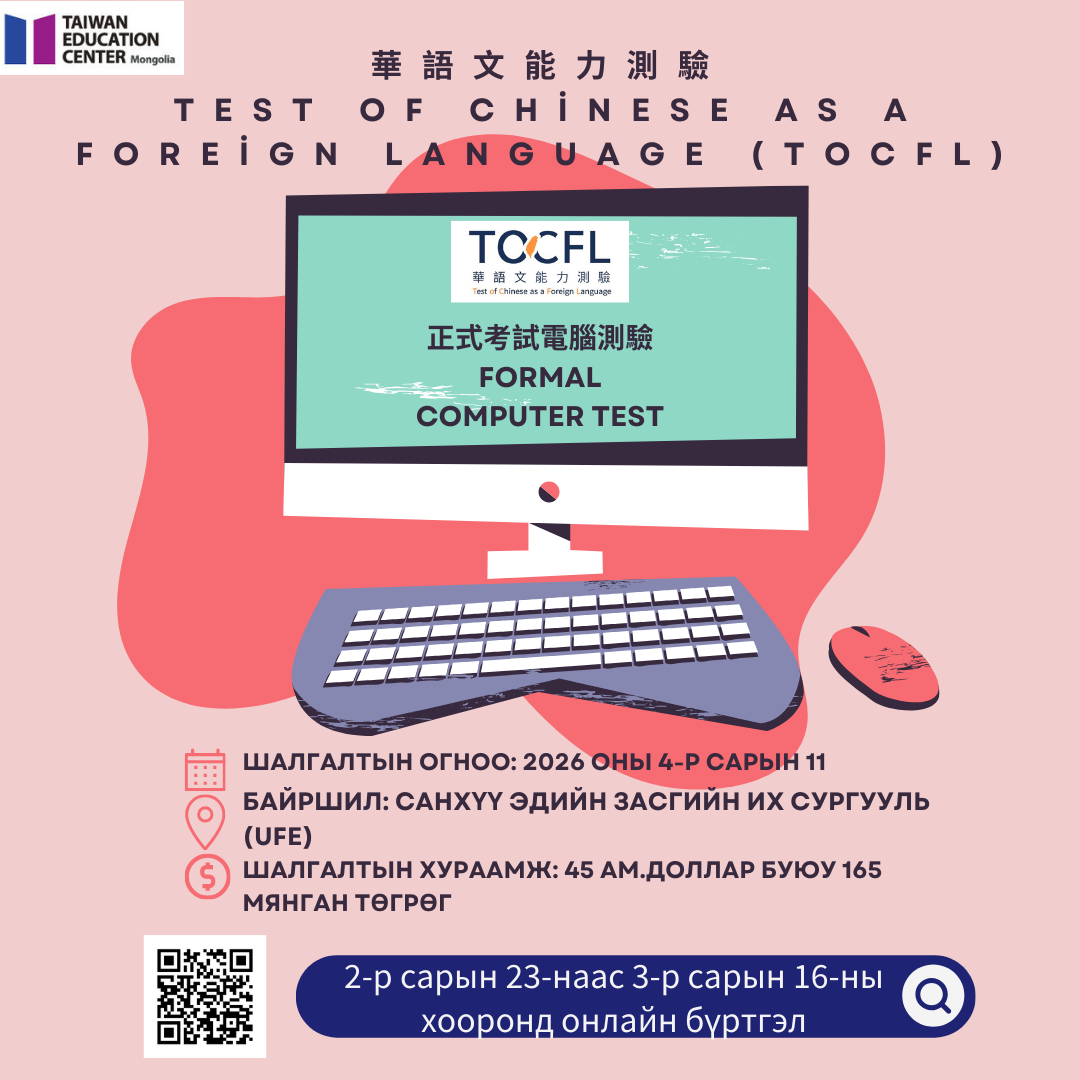 2026 оны Хятад хэлний түвшин тогтоох шалгалтын зар (TOCFL)2026 оны Тайваний Хятад хэлний түвшин тогтоох шалгалт (TOCFL) -ын Улаанбаатар хот дахь эхний шалгалтын бүртгэл эхэллээ. Та бүхнийг идэвхтэй бүртгүүлж, өргөнөөр оролцохыг урьж байна. 2026 TOCFL шалгалтын мэдээлэл:Шалгалтын өдөр: 2026/04/11Шалгалт авах байршил: Санхүү Эдийн Засгийн Их сургууль (СЭЗИС)Шалгалтын хураамж: 165,000 төгрөгБүртгэлийн хугацаа: 2/23-3/16Бүртгүүлэх холбоос: https://reurl.cc/la36ZQ Анхаарах зүйлс: 2026 оноос эхлэн Тайвань руу бакалавр болон түүнээс дээш зэрэгт суралцах хүсэлтэй бөгөөд сургалтын хөтөлбөрийн зарим хэсгийг эсвэл бүхэлдээ хятад хэлээр суралцахаар төлөвлөж байгаа бол оюутны виз мэдүүлэхэд заавал TOCFL шалгалтын L2 түвшнээс дээш түвшний гэрчилгээ шаардагдана.Тайваний Боловсролын яамны тэтгэлэгт (MOE) өргөдөл гаргасан оюутан болон бүрэн англи хэл дээр явагддаггүй хөтөлбөрт суралцах оюутан заавал TOCFL-ийн L3 ба түүнээс дээш түвшний оноотой байх шаардлагатай.TOCFL шалгалтын гэрчилгээ нь олгогдсон өдрөөс хойш 2 жилийн хугацаанд хүчинтэй ба TOCFL шалгалтын гэрчилгээгүй оюутны тэтгэлэг болон визний өргөдлийн материалыг хүлээн авахгүй.