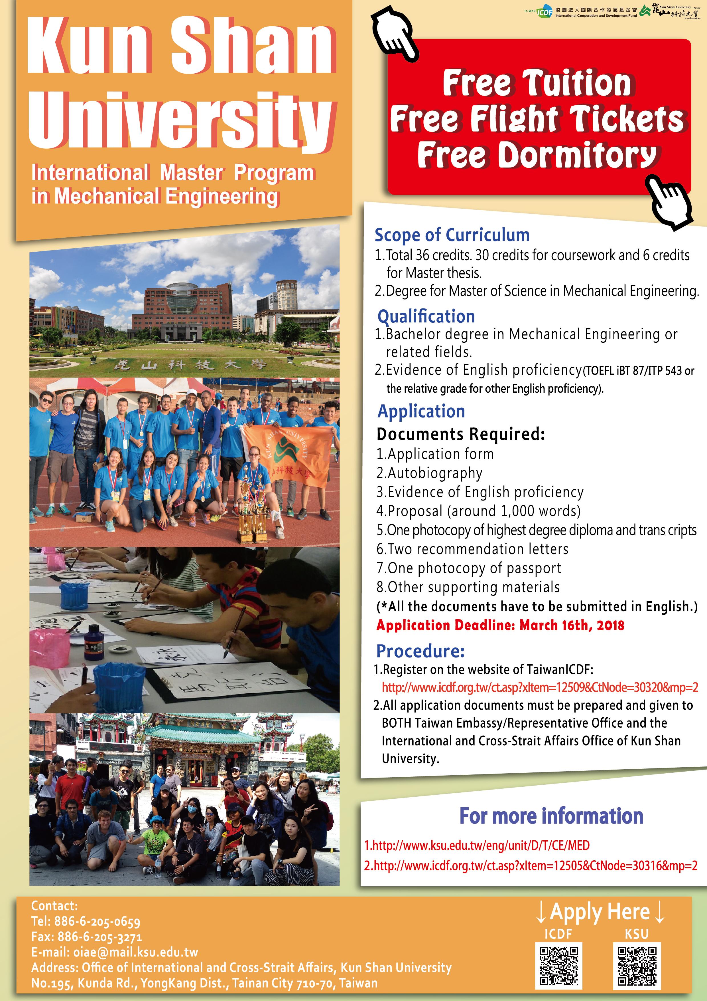 Тайванийн Кунь Шаны их сургууль нь Механикийн инженерийн магистрын зэргийн тэтгэлэгт хөтөлбөртөө гадаад оюутан элсүүлж эхэллээ. Бүртгэл 2018 оны 3-р сарын 16-ны өдрийг дуустал хийгдэх ба http://www.icdf.org.tw/ct.asp?xItem=12505&CtNode=30316&mp=2 цахим хуудаснаас холбогдох мэдээллийг авах боломжтой.