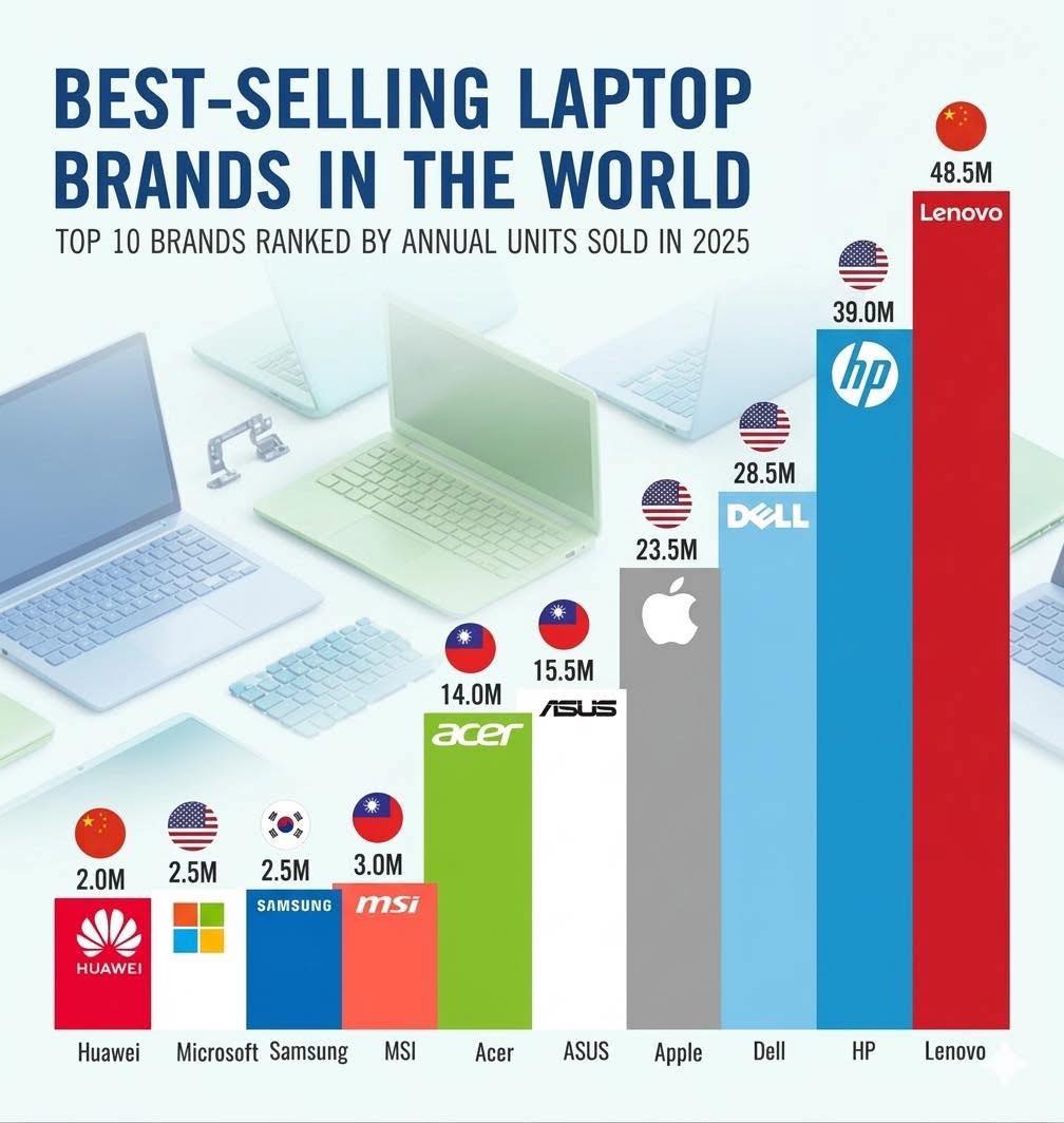 根據國際數據公司統計,2025年全球前十大暢銷筆電品牌中,Acer(宏碁)、ASUS(華碩)及MSI(微星)三大台灣品牌合計銷售量超過3,250萬台