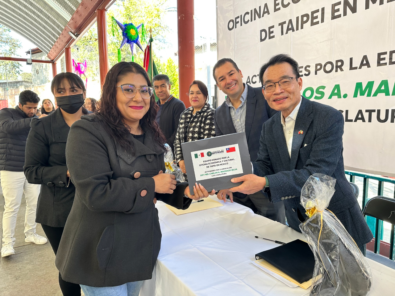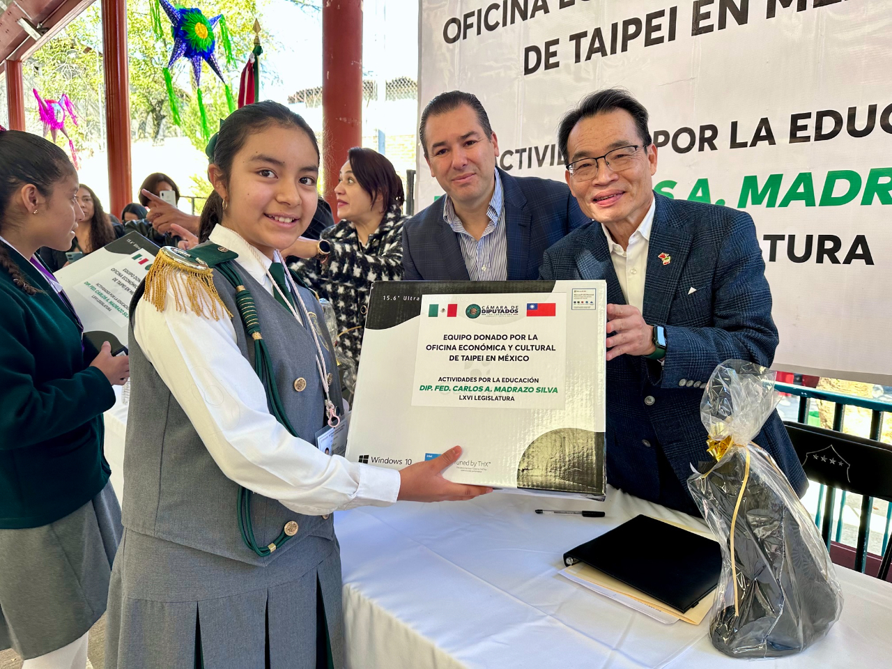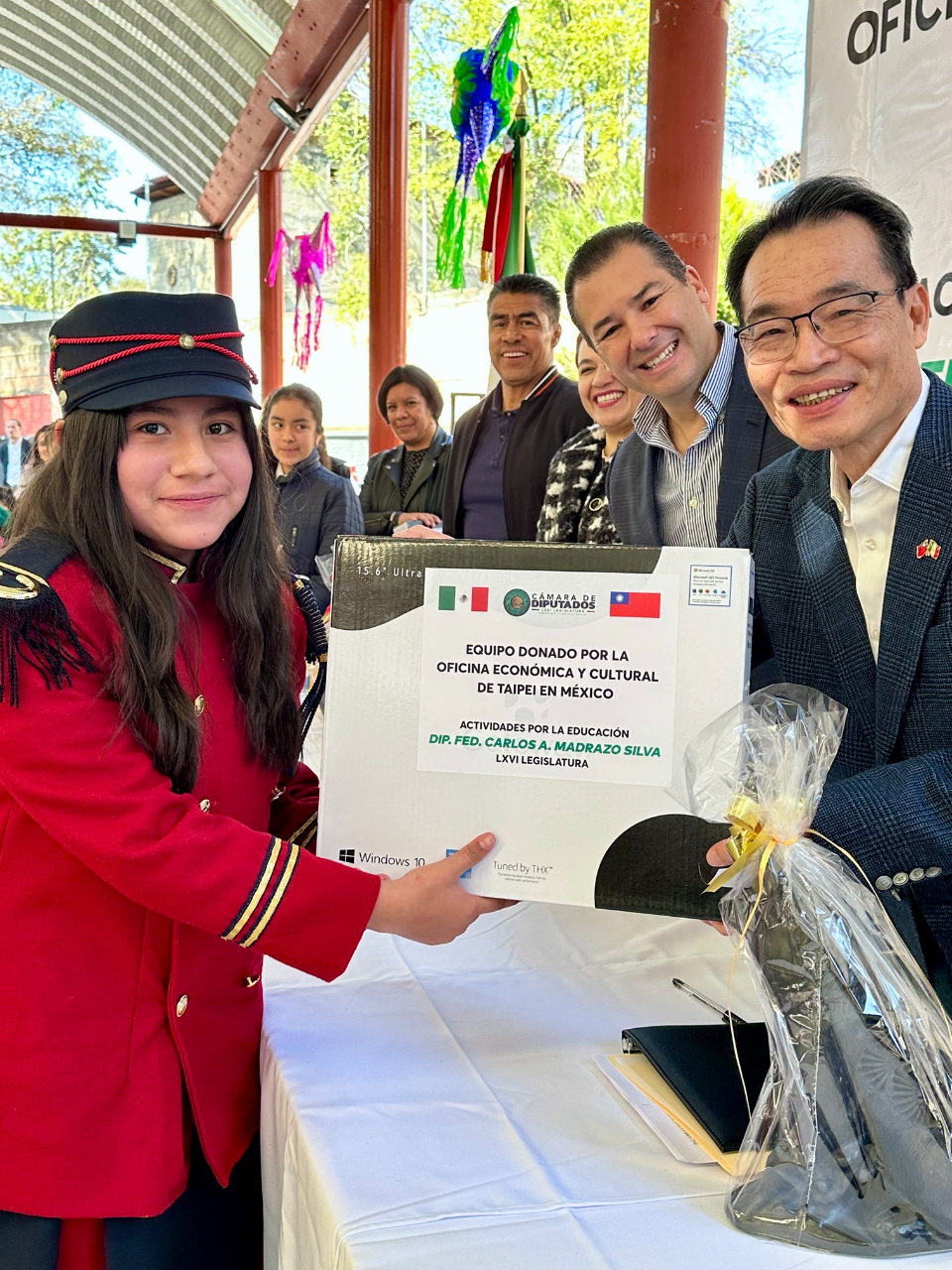 鄭大使113年12月9日應邀前往墨西哥市Cuajimalpa區Xochiquétzal小學,與聯邦眾議員Carlos Arturo Madrazo Silva共同主持我捐贈該校師生電腦設備公開贈交儀式。