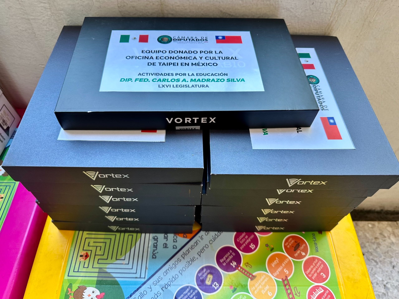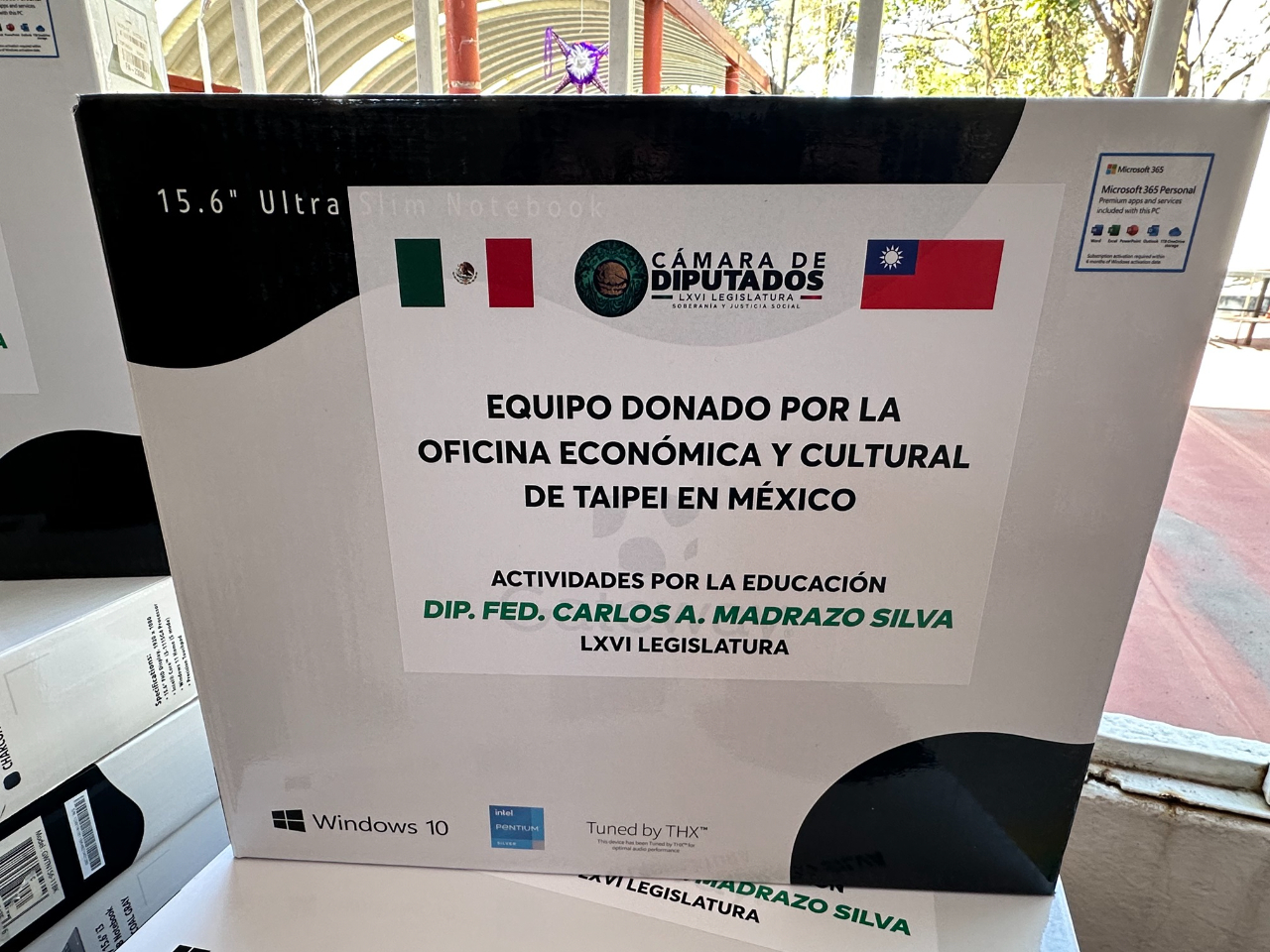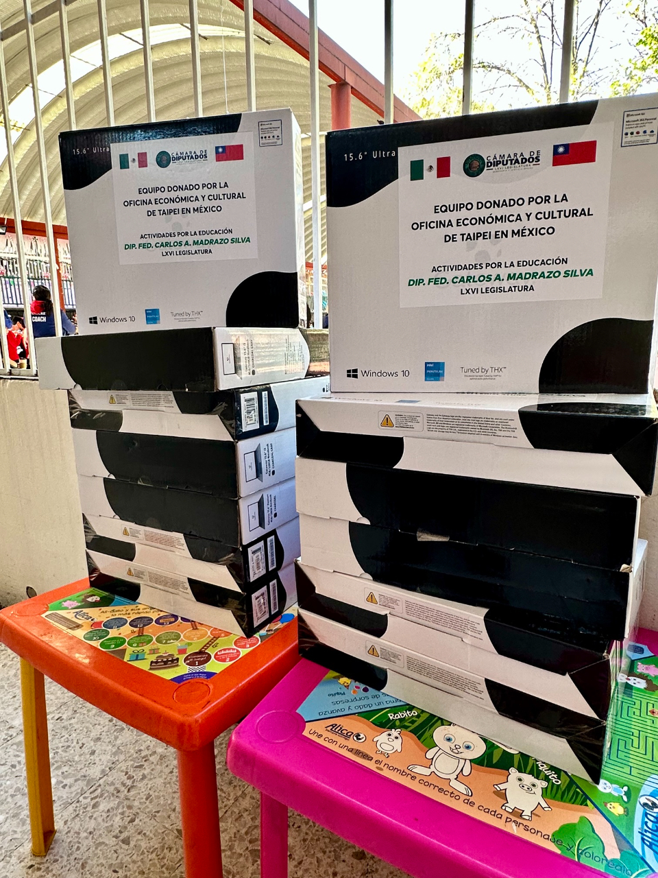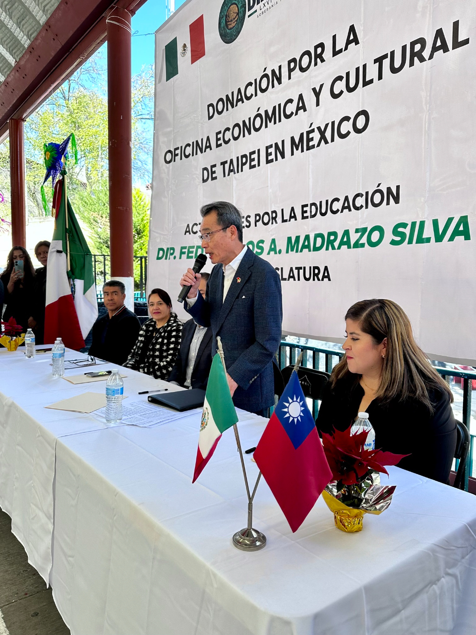 鄭大使113年12月9日應邀前往墨西哥市Cuajimalpa區Xochiquétzal小學,與聯邦眾議員Carlos Arturo Madrazo Silva共同主持我捐贈該校師生電腦設備公開贈交儀式。