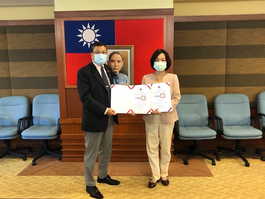 洪大使慧珠(右)頒發馬來西亞臺灣商會聯合總會總會長林永昌推動臺灣參與WHO及WHA感謝狀