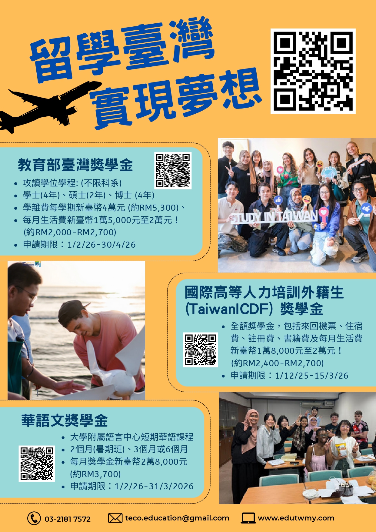 為鼓勵青年學子留學臺灣,2026年度駐馬來西亞臺北經濟文化辦事處共提供三項獎學金供馬來西亞學子申請: