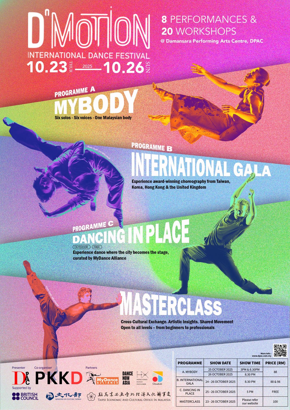 D’MOTION睽違10年再次重新舉辦,本年節目分為三個單元,內容扎實豐富,除了兼顧在地與國際,並邀大師與新秀共同參與。「My Body」單元呈現六位馬國資深與新銳編舞家六支風格鮮明的獨舞,透過身體回應當下課題,探索當代表現與在地身體美學的關係;「國際匯演」單元邀請來自臺灣、香港、韓國與英國四位編舞家,共同呈現五支雙人舞作品;「Dancing in Place」則由大馬舞蹈聯盟策劃,邀請馬國各大藝術院校舞蹈系學生參與,走出劇場在城市空間裡演出,讓觀眾感受舞蹈與環境的互動。