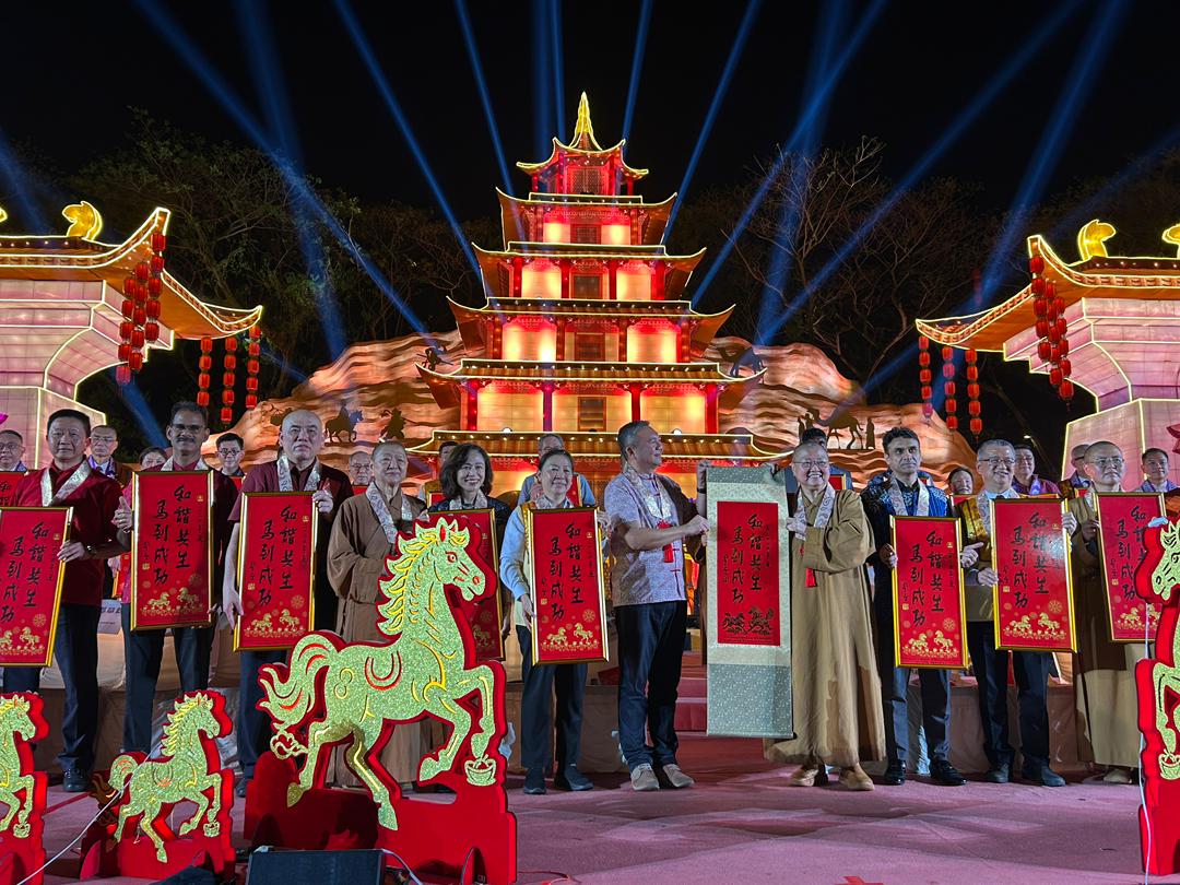 今年的主題燈飾為高達18公尺的莫高窟造型燈組,巧妙融合佛教藝術元素與新春喜慶的氛圍,在璀璨燈海中格外莊嚴壯觀。透過啟燈儀式,祝福大家在新的一年裡馬到成功、平安喜樂,也期盼在「和諧共生」的精神下,共創更加光明燦爛的未來!