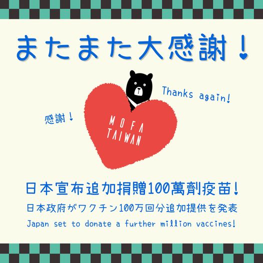 《鬼滅之刃》的故事告訴我們「相信夥伴團結一致,終能贏來正義」,今天這股感動再次重溫你我心頭。 繼6月4日宣布捐贈台灣124萬劑疫苗後,時隔3週日本外相茂木敏充今天再宣布將追加提供100萬劑疫苗,協助台灣對抗COVID-19,疫苗預定7月中旬前運抵台灣。全球疫情仍舊嚴峻,日本友人二度溫暖馳援,印證了「#海內存知己、#天涯若比鄰」,台灣人民永銘在心,感謝日本政府與各界友人,深信共享自由民主價值的台日夥伴,只要攜手彼此,我們必能一起度過難關。 台日深厚友誼堅定不移的光輝,不僅是國際社會互助的模範,也是遏止疫情的最佳示範,外交部誠摯感謝國際間友人 #彼此扶持 的協助。