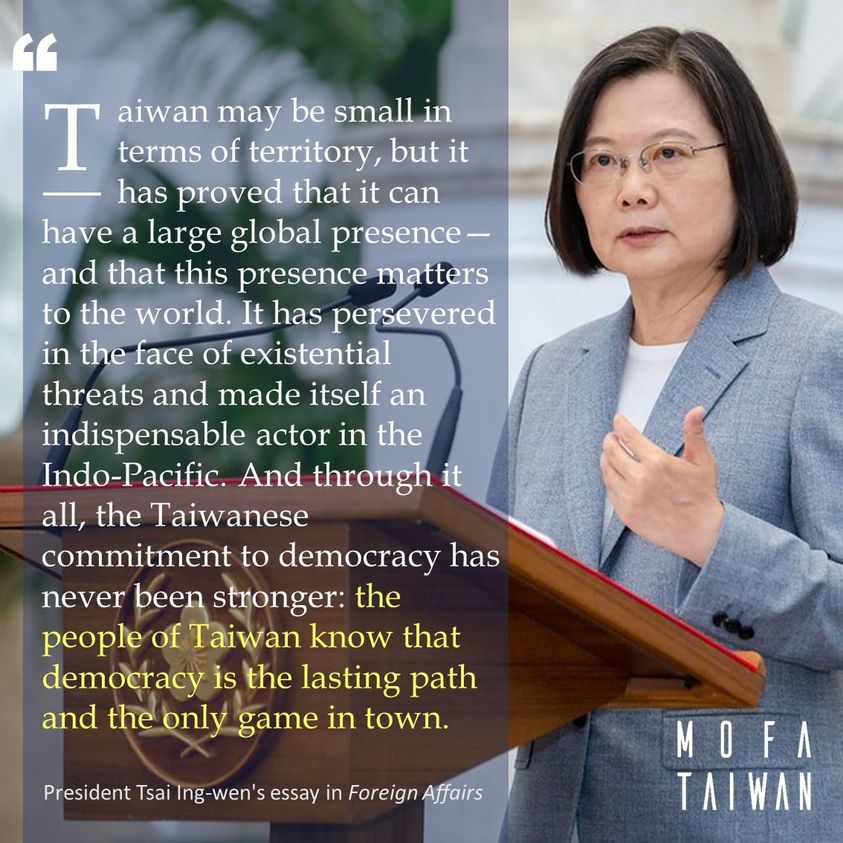 國際媒體 Foreign Affairs 刊登蔡英文總統投書,透過這篇文章,蔡總統向世界表達台灣對民主的主張: