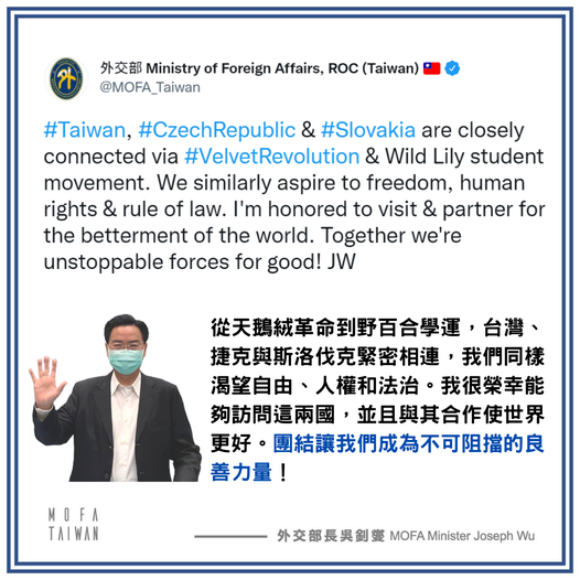 吳部長在出發前用推特表示:「從天鵝絨革命到野百合學運,台灣、捷克與斯洛伐克緊密相連,我們同樣渴望自由、人權和法治。我很榮幸能夠訪問這兩國,並且與其合作使世界更好。團結讓我們成為 #不可阻擋的良善力量!」