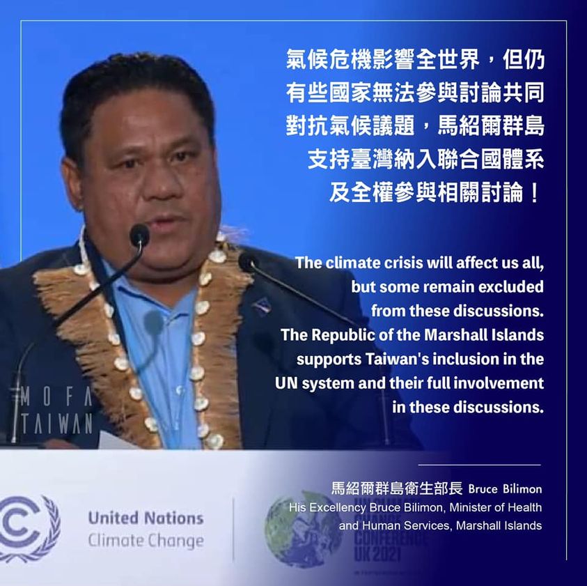 感謝 #馬紹爾群島 衛生部長Bruce Bilimon 在COP26 部長級高階會議發聲支持臺灣共同攜手對抗氣候變遷及參與聯合國體系!