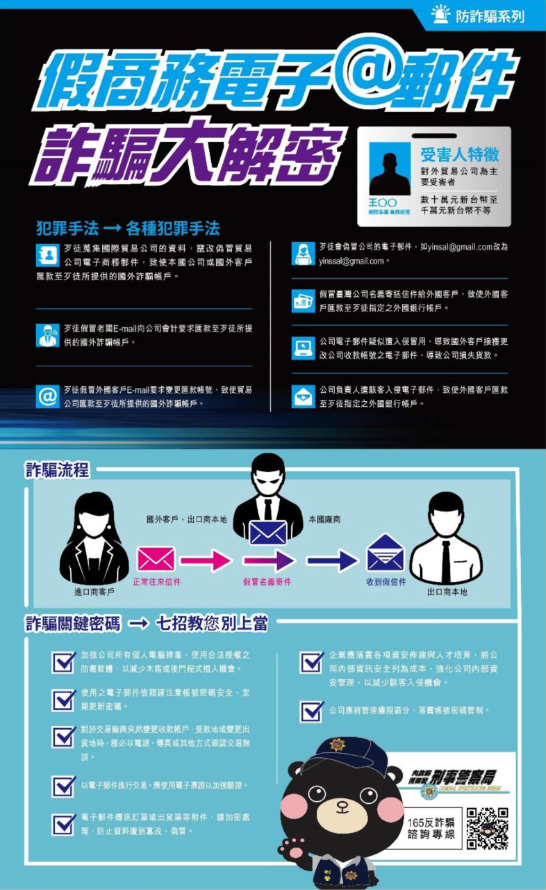 內政部警政署製作【竄改電子商務郵件詐騙!】宣導海報,提醒國人避免被類似手法詐騙!如有詐騙相關疑問,建議可撥打165反詐騙諮詢專線諮詢。
