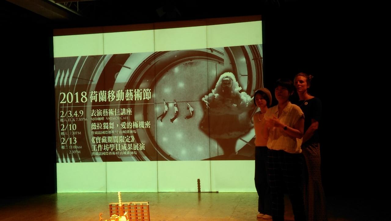 荷蘭「移動表演藝術學院」於2018年8月29日邀請台灣策展人楊佩璇(左)演講有關在台灣所舉辦活動。