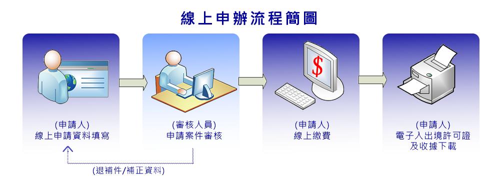 2. 申請人於新系統提出申請後, 5日內即可獲知審核結果。獲得通過者,申請人將接獲電子郵件通知,嗣於網路上以信用卡直接繳費,即可自行下載列印繳費收據及赴臺觀光許可證,毋須再至駐外舘處送件及取證。(信用卡繳費係以新臺幣計價,並以繳費時之匯率扣款。)
