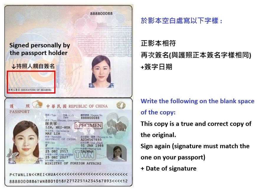 - When submitting a copy, ensure that the original passport has been personally signed. Colour photocopies of the passport, including the signature page, should be marked with "Certified True Copy" and signed & dated again on the copy. This procedure also applies to other residence documents. No notarization required. (See picture below)