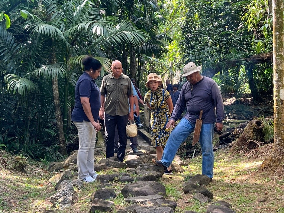 The site visit to the Stone Path Rehabilitation Project at Oikull, Airai, was guided by Dr. Patrick Tellei and attended by Minister Ngirai Tmetuchl, Governor Norman Ngiratecheboet, Chief Dr. Yano and Minister Counselor Franklin Chen of the Embassy and other guests, February 19, 2024.