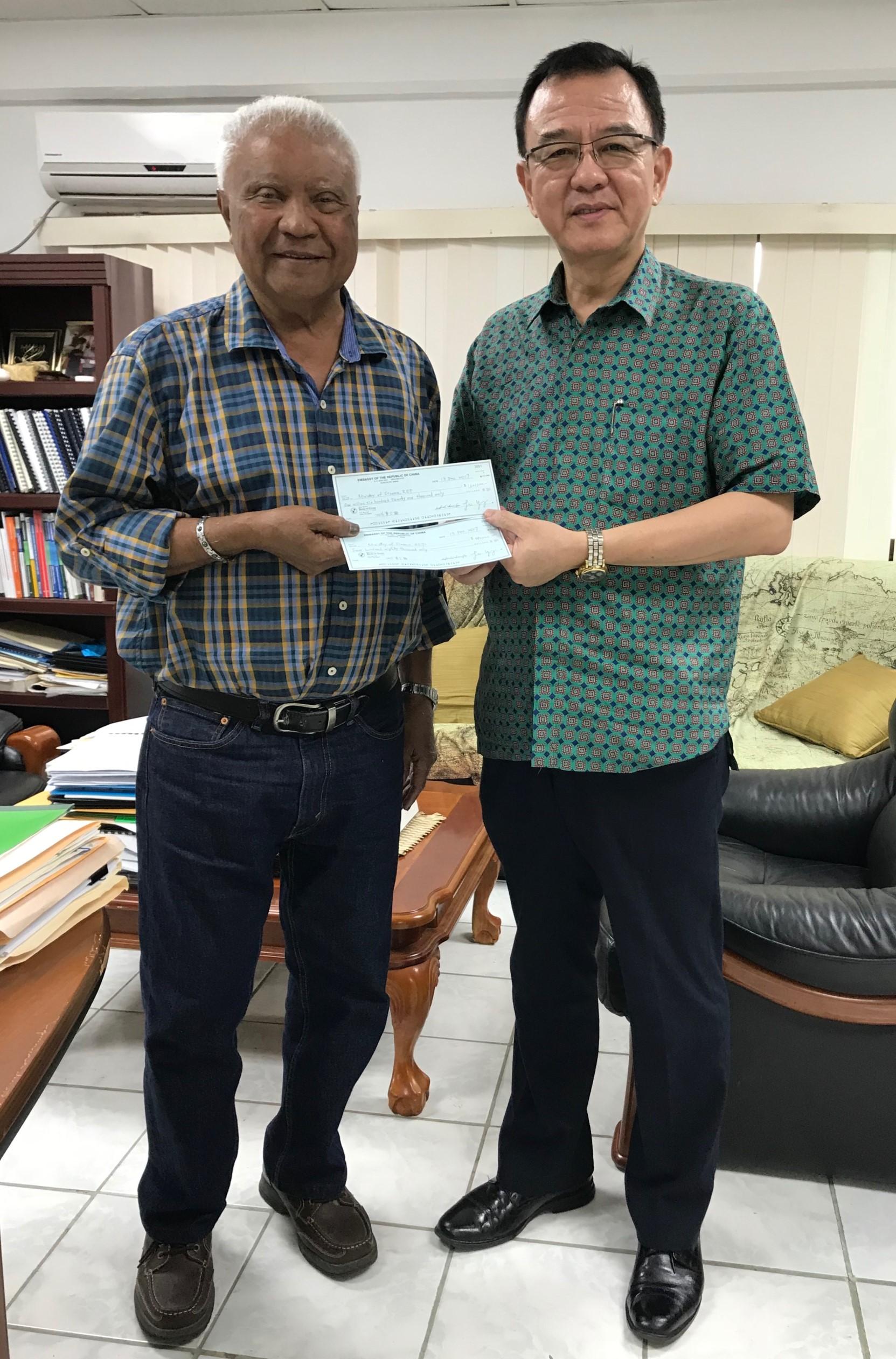 On December 20, 2017, Ambassador Michael Y. K. Tseng of the ROC (Taiwan) Embassy presented two checks amounting to 2,101,000 US dollars, as the fifth tranche of 2015 annual grant and the fifth tranche of 2016 annual grant, to Hon. Elbuchel Sadang, Minister of Finance.