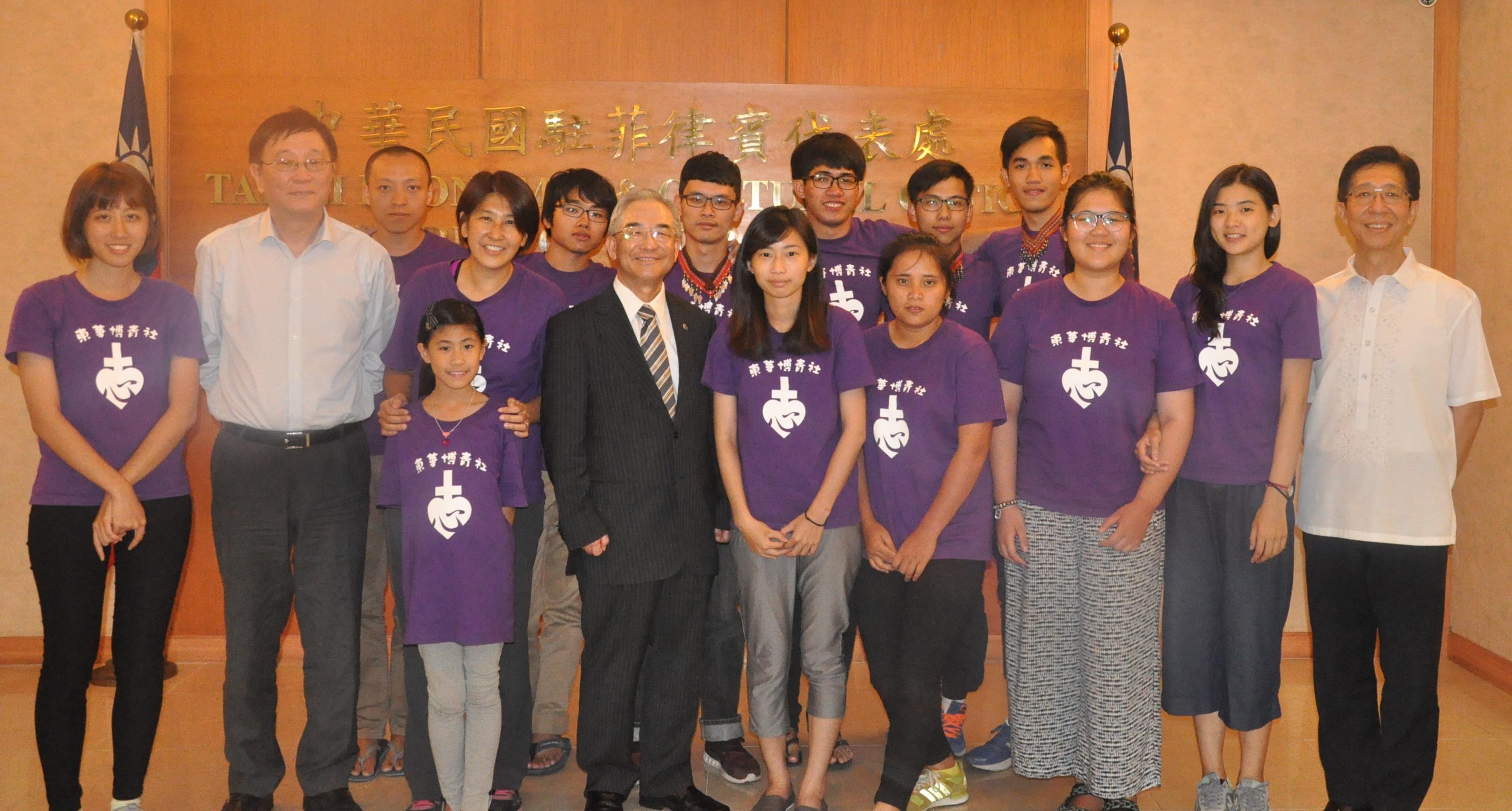 Group Photo: Ambassador Gary Song-Huann Lin, Minister Samson Chang and Press Division Director Jerry Chuang take a group photo with the student volunteers from the Dong Hwa University in Taiwan during their courtesy visit on July 7, 2016.