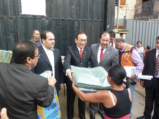 駐巴拉圭劉大使德立與代理總統艾法拉發放我人道物資濟助水患災民,急難部長駱阿及亞松森市長沙馬涅哥陪同