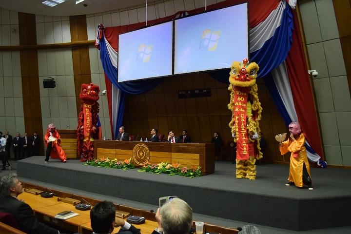 巴國國會暨參議院院長阿瑟維多(Roberto Acevedo)(中)、眾議院議長韋拉斯格斯(Hugo Velázquez)(右)與駐館俞大使(左)共同主持。