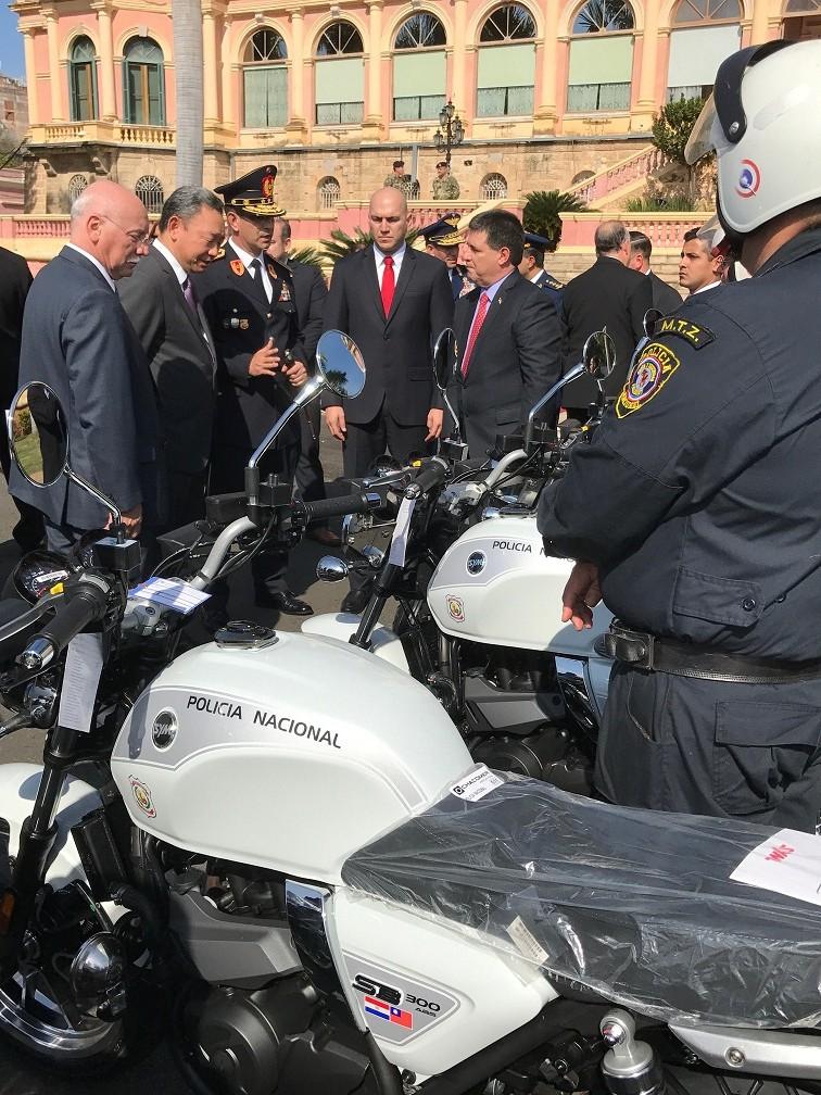 俞大使陪同卡提斯總統、巴外長羅依沙卡(左一)及內政暨警政首長視察我援贈機車。