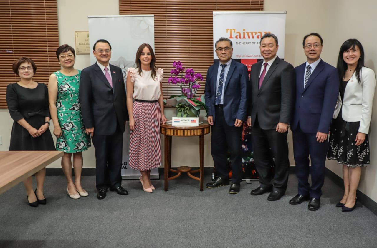 駐巴拉圭周麟大使於108年5月8日下午陪同台灣糖業股份有限公司黃董事長育徵、外交部拉美司俞司長大 、國合會史副秘書長立軍及台糖陳副執行長黎珍赴巴國總統官邸,拜會並致贈第一夫人席凡娜(Silvana Abdo)由台糖培育出的新品種蝴蝶蘭苗。