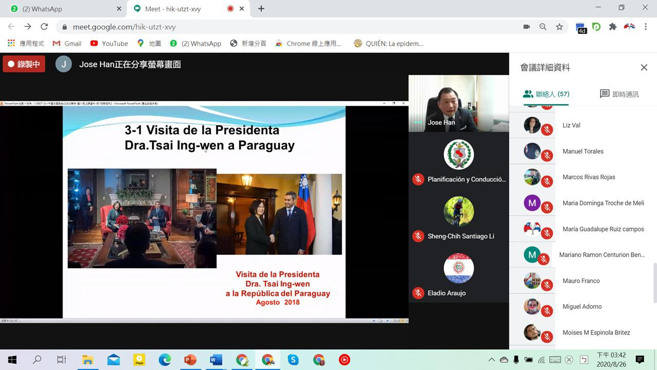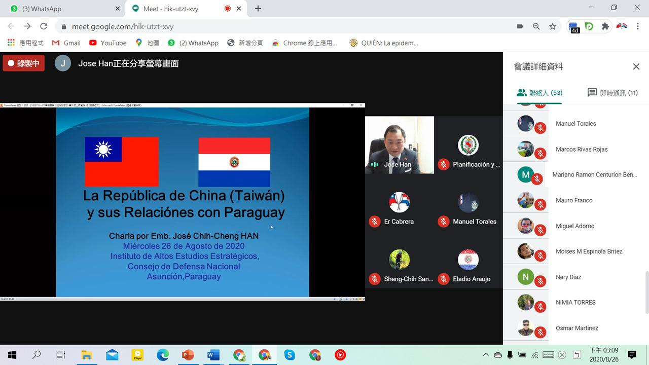 駐巴拉圭韓志正大使8月26日下午為巴拉圭高等戰略研究院(IAEE)戰略碩士班第52期學員演講,韓大使分享台灣這70年來,從60年代教育普及、70年代經濟起飛到90年代政治民主化等政經、社會發展經驗。韓大使也說明了駐館近年來所執行的雙邊合作計畫,包括興建平民住宅、淡水白鯧及鴨嘴魚等水產養殖計畫、醫療資訊管理系統效能提升計畫、蘭花繁養殖計畫、微中小企業輔導計畫、設立臺巴科技大學與提供台灣獎學金等。特別是教育方面的合作,我們期盼透過台巴科大與獎學金,10年後可為巴國培育1,500位科技人才。