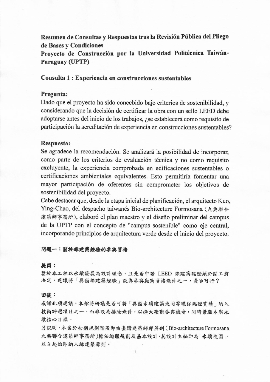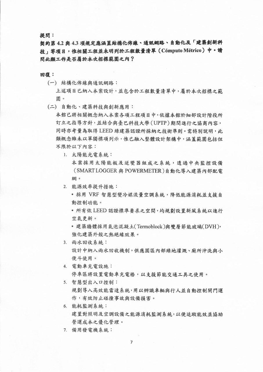 《臺灣-巴拉圭科技大學(UPTP)新建工程招標案》 公開閱覽之問與答彙整