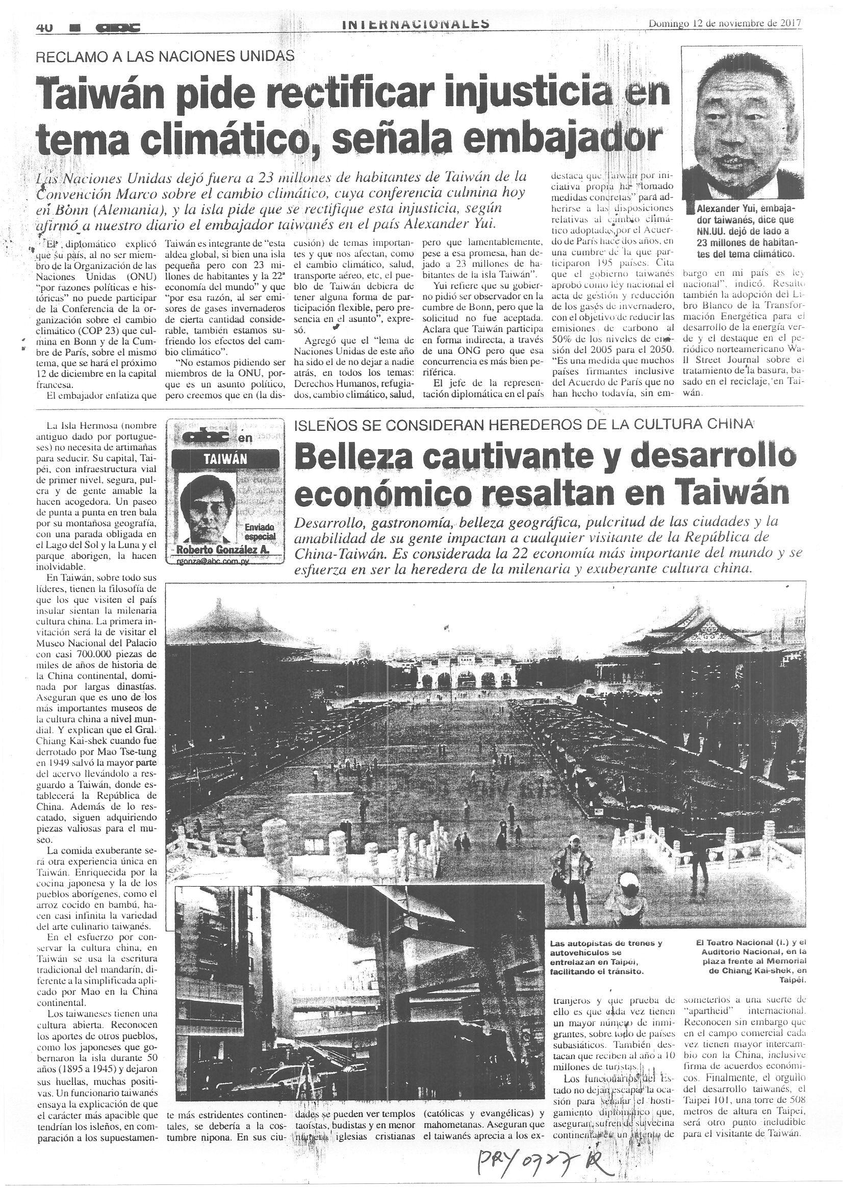 上述報導於本月12日該報國際版刊登,另同版面併刊登該報甫受邀赴華參加「西語記者團II」之政治版記者Roberto González有關臺灣經貿發展專題報導,整體彩色版面乙全頁,相當醒目。