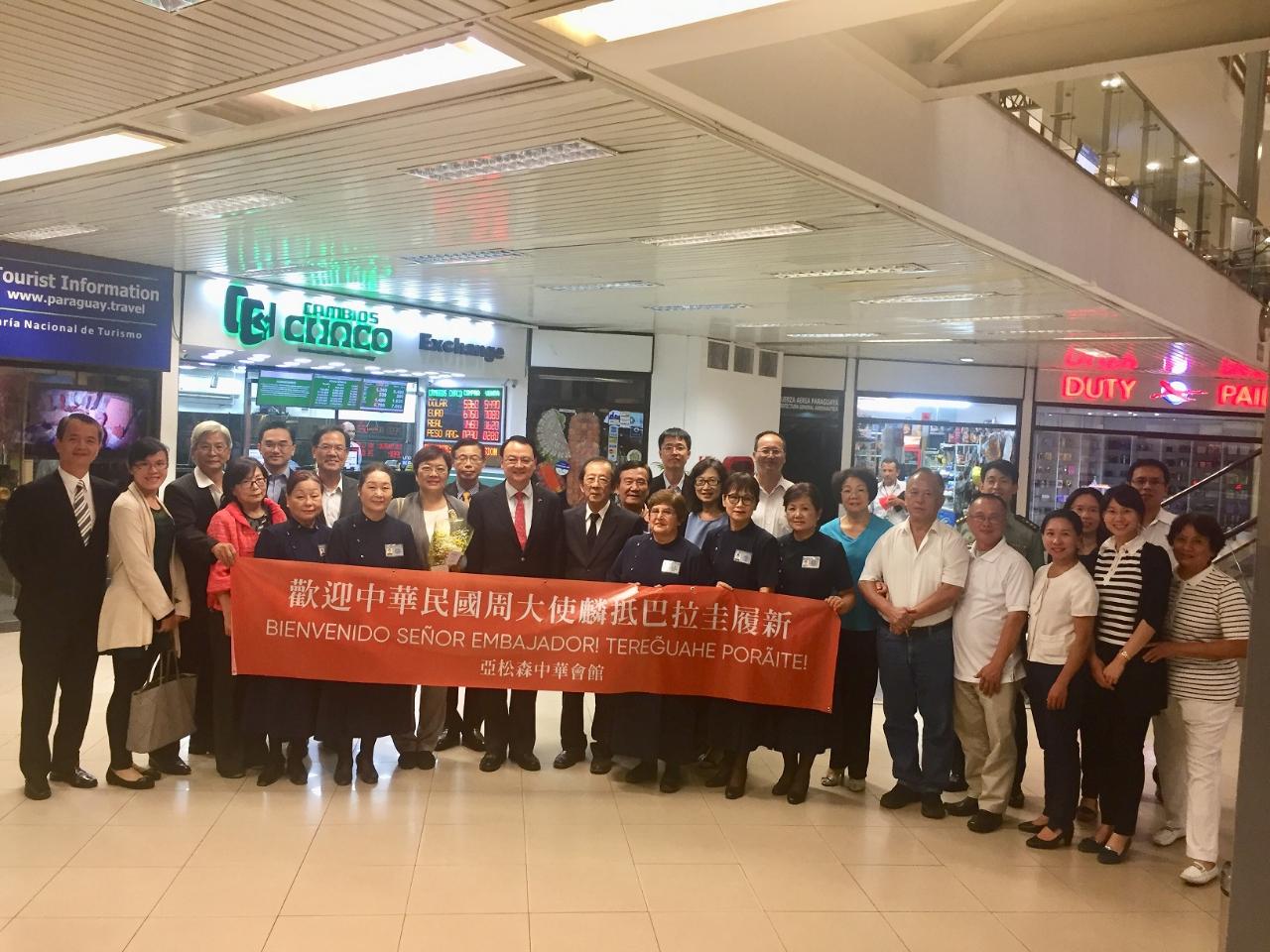 因機場管制區空間有限,為免影響其他旅客通關,另有僑務顧問謝德俊夫婦、僑務顧問暨巴拉圭中正學校監事長許德明夫婦、亞松森基督教臺語教會鄭慶隆長老夫婦、巴拉圭一貫道總會會長蔣清安、慈濟基金會亞松森聯絡處全體委員等僑團代表,一直守候在機場入境大廳。等到周大使夫婦一出現,紛紛湧上表達僑界對周大使夫婦最熱情的歡迎,周大使夫婦親切與接機僑領及僑團代表一一握手致謝,場面溫馨。