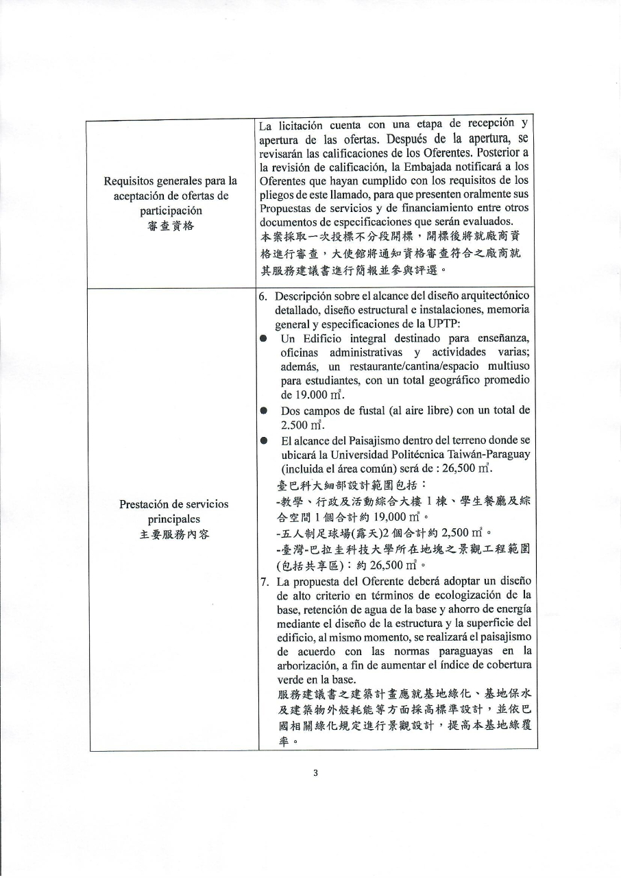 | Dirigido a邀請對象 | Personas jurídicas, concretamente Estudios de arquitectos y Agencias consultoras que deberán contar con experiencia previa y equipo acreditado de profesionales en las áreas requeridas, según lo indicado en los Términos de Referencia:具備本計畫相關經驗、資歷及專才之法人,即建築師事務所及工程技術顧問公司如招標文件所示:1. Persona jurídica debidamente constituida ante la República del Paraguay, con registro de licencia, certificado fiscal, certificado de crédito y otros documentos pertinentes cumpliendo con todas las de la ley.