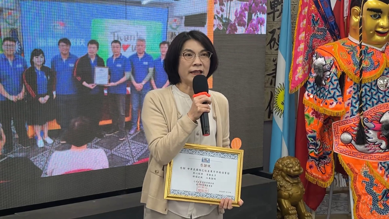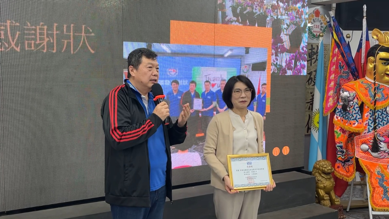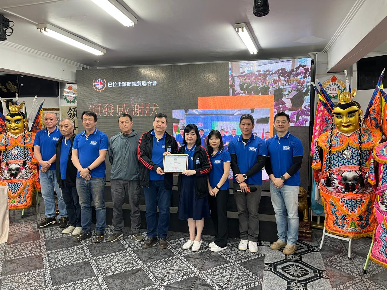 陳慧芬總領事應邀出席「巴拉圭華商經貿聯合會第14屆第2次會員大會暨第15屆理監事改選大會」,現場氣氛隆重熱烈,僑界菁英齊聚一堂! 陳總領事致詞中肯定並感謝第13、14屆王永旭會長、宋彥欣監事長及理監事團隊4年來的熱忱付出,無論是會員講座、商務考察,還是承辦僑委會美食巡迴講座與行銷台灣文化活動,都為提升台僑能見度、促進主流社會連結貢獻良多。 陳總領事也期許新一屆理監事團隊儘速順利產生,持續團結服務僑界,成為台灣與巴拉圭交流的重要橋樑。 最後,陳總領事並代表僑委會頒贈感謝狀予王會長及宋監事長,以表彰其傑出貢獻。