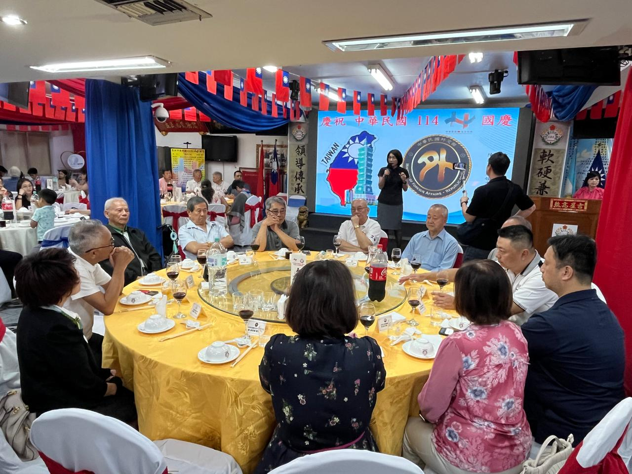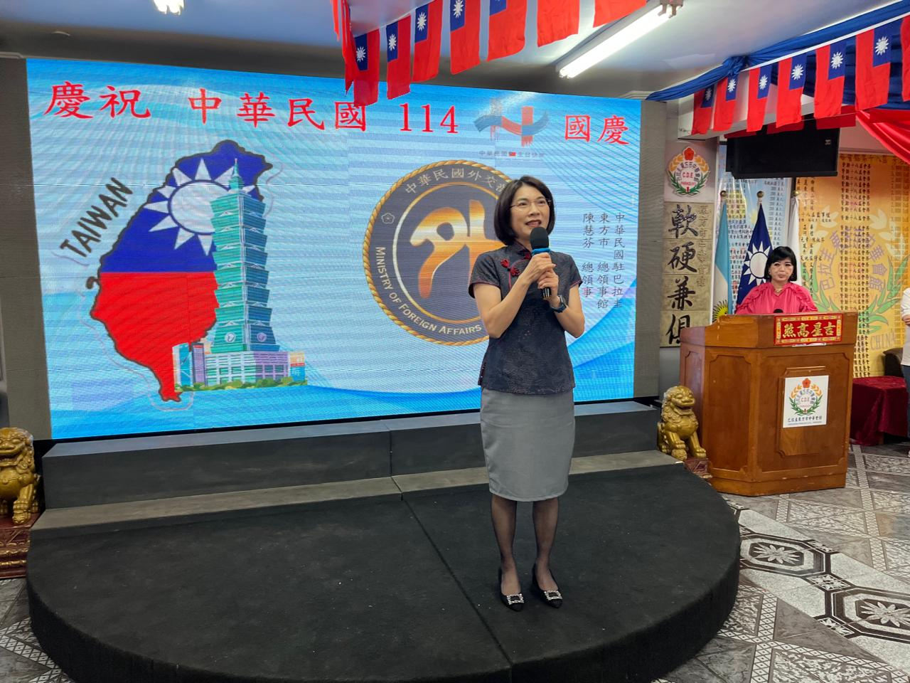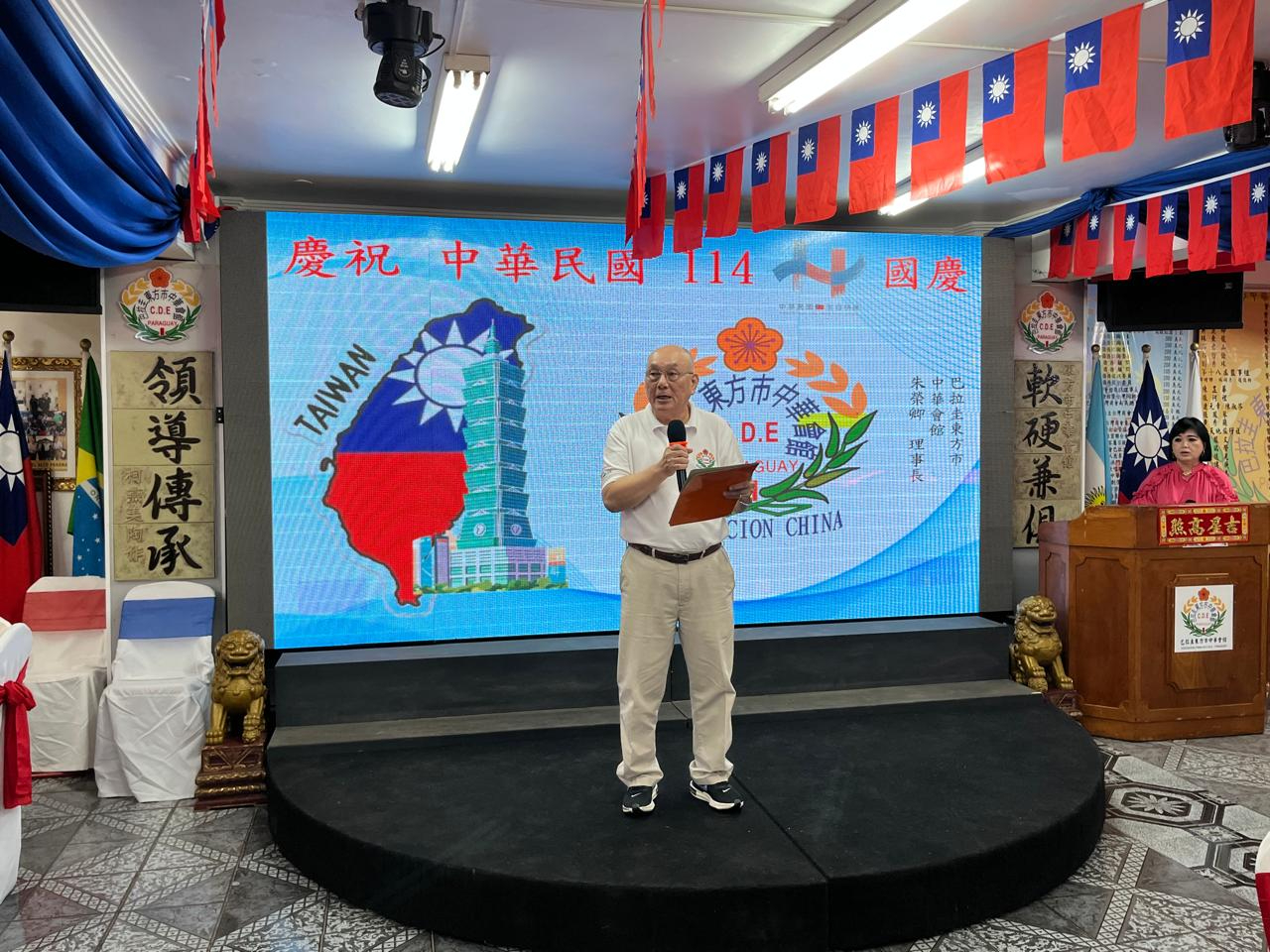 陳總領事出席東方市中華會館舉辦的「雙十國慶全僑餐會」,當晚席開15桌,僑胞鄉親、老中青三代與巴拉圭友人齊聚一堂,共慶中華民國114年國慶。 陳總領事感謝中華會館長年服務僑社、凝聚僑心的努力,也特別讚揚朱榮卿理事長對總領事館的大力支持。 會中由中山僑校學生 帶來動人的古箏演奏,陳總領事也與僑胞們歡唱同樂在熱鬧的抽獎活動中,大家滿載而歸,氣氛溫馨又歡樂。