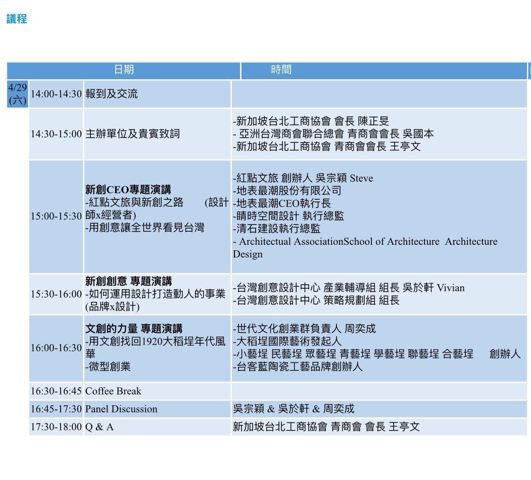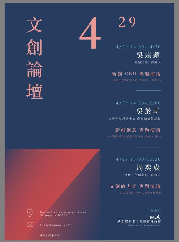 新加坡青商會將於4月29日舉辦「文創論壇」 - 駐新加坡台北代表處 Taipei Representative Office in the Republic of Singapore ::: 跳到主要內容區塊