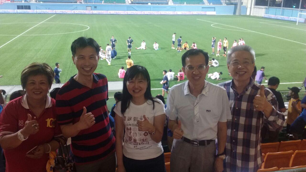 駐新加坡台北代表處副代表戴輝源(右二)、僑務委員陳正吉(右一)、新加坡台北工商協會副會長黃秀琴(左一)、中華航空新加坡分公司總經理陳宗琪(左二)等共同到場為「中華民國足球協會」代表隊加油。